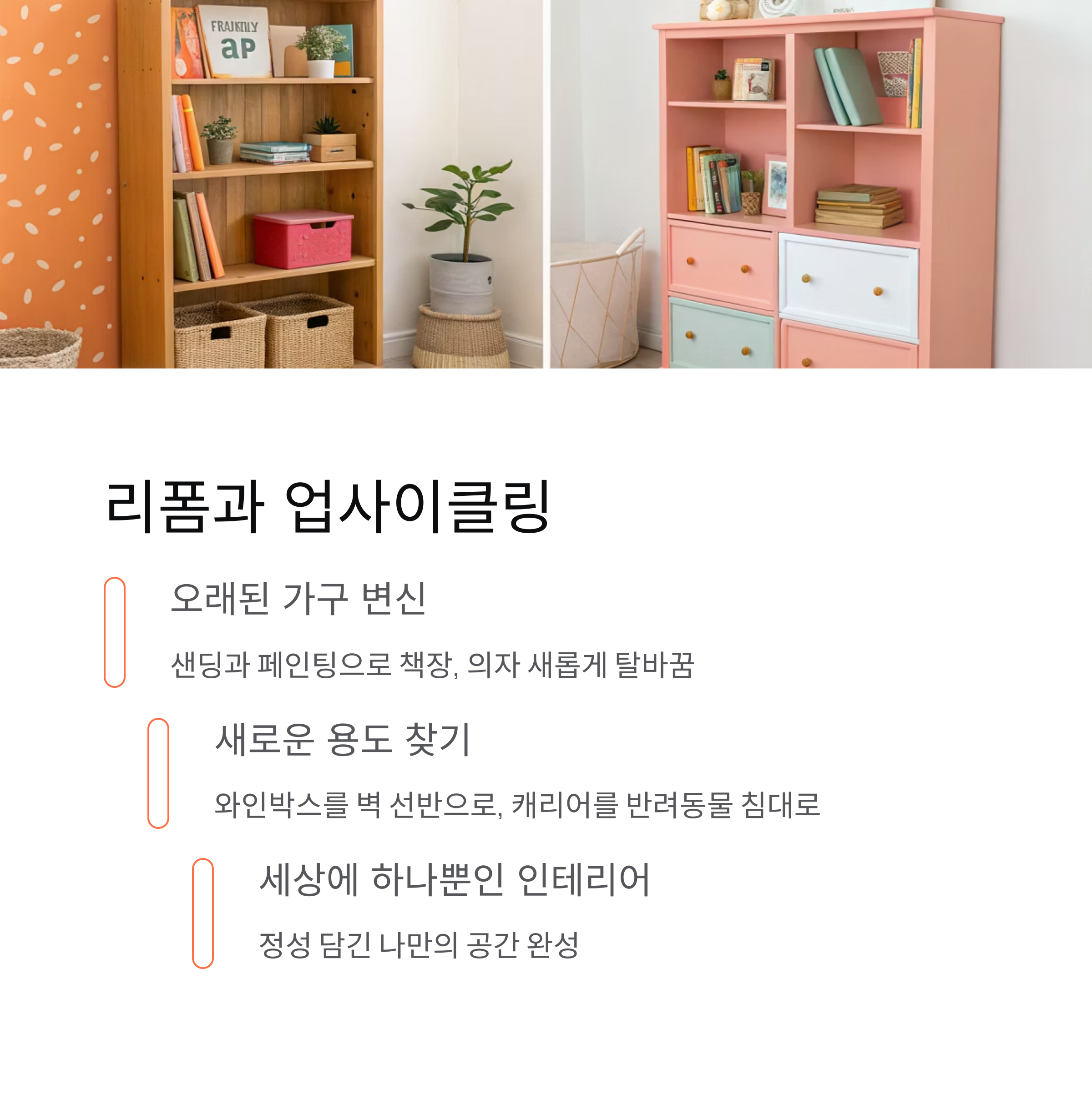 리폼과 업사이클링은 기존에 가지고 있던 가구나 물건에 새로운 생명을 불어넣는 인테리어 방식이에요. 새 제품을 구매하는 대신, 낡은 가구를 리폼해서 사용하는 것은 환경을 생각하는 동시에 가성비도 챙기는 아주 좋은 방법이랍니다. 직접 손으로 만드는 재미도 있고, 나만의 스타일도 담을 수 있어요.