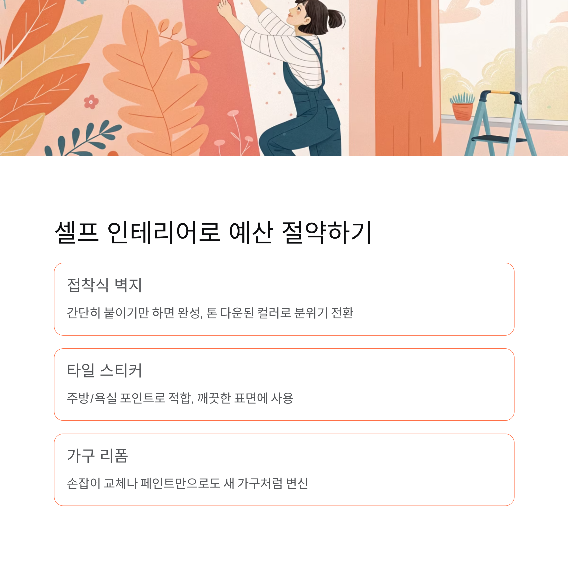 이처럼 셀프 인테리어는 비교적 저렴한 비용으로 큰 만족을 느낄 수 있어요. 나만의 손길이 들어간 공간은 오래 머물고 싶게 만들죠. 완벽하지 않아도 내가 직접 꾸민 공간이라는 뿌듯함이 정말 커요. 💪