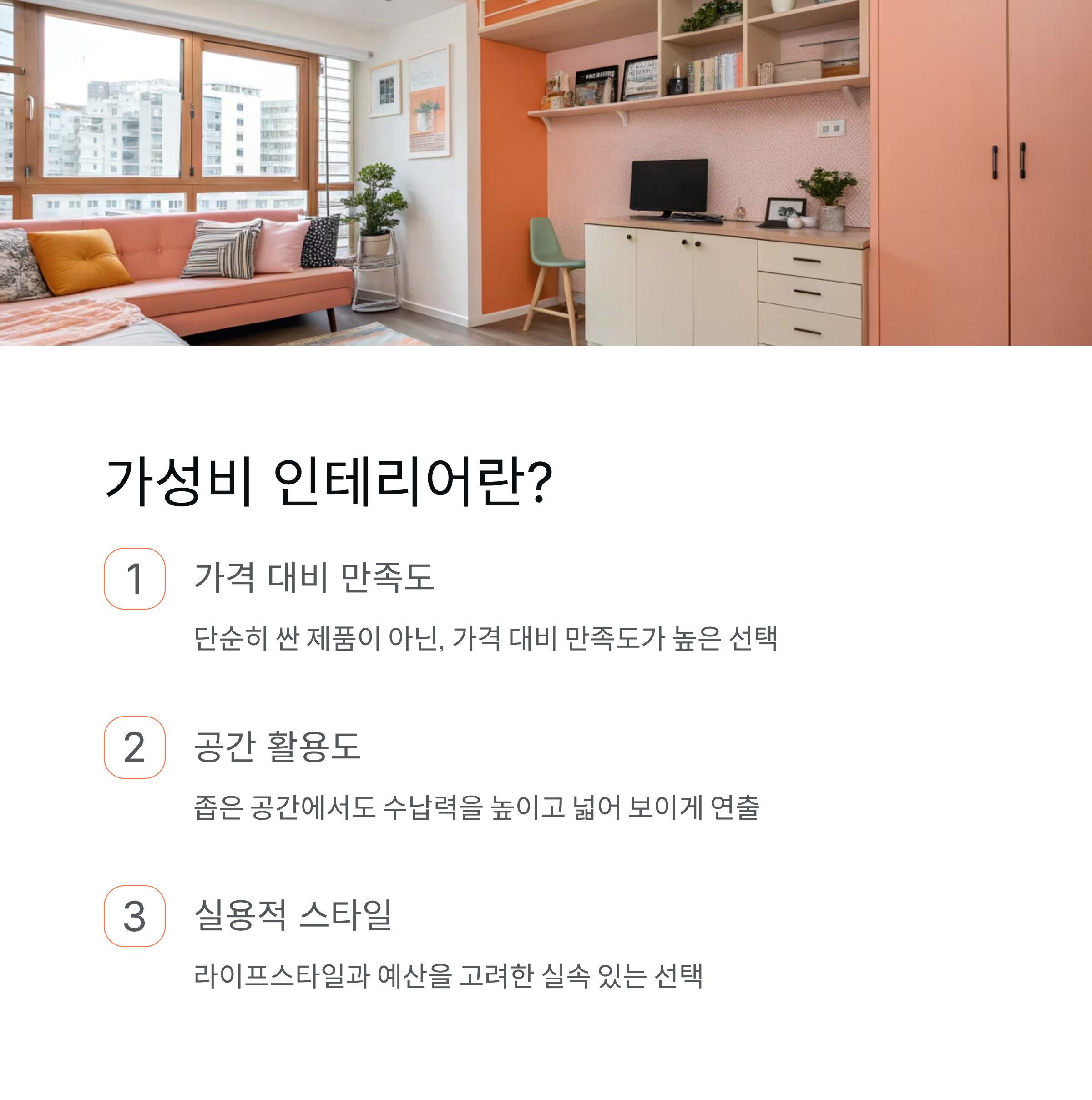 | 항목 | 가성비 인테리어 | 고가 인테리어 |