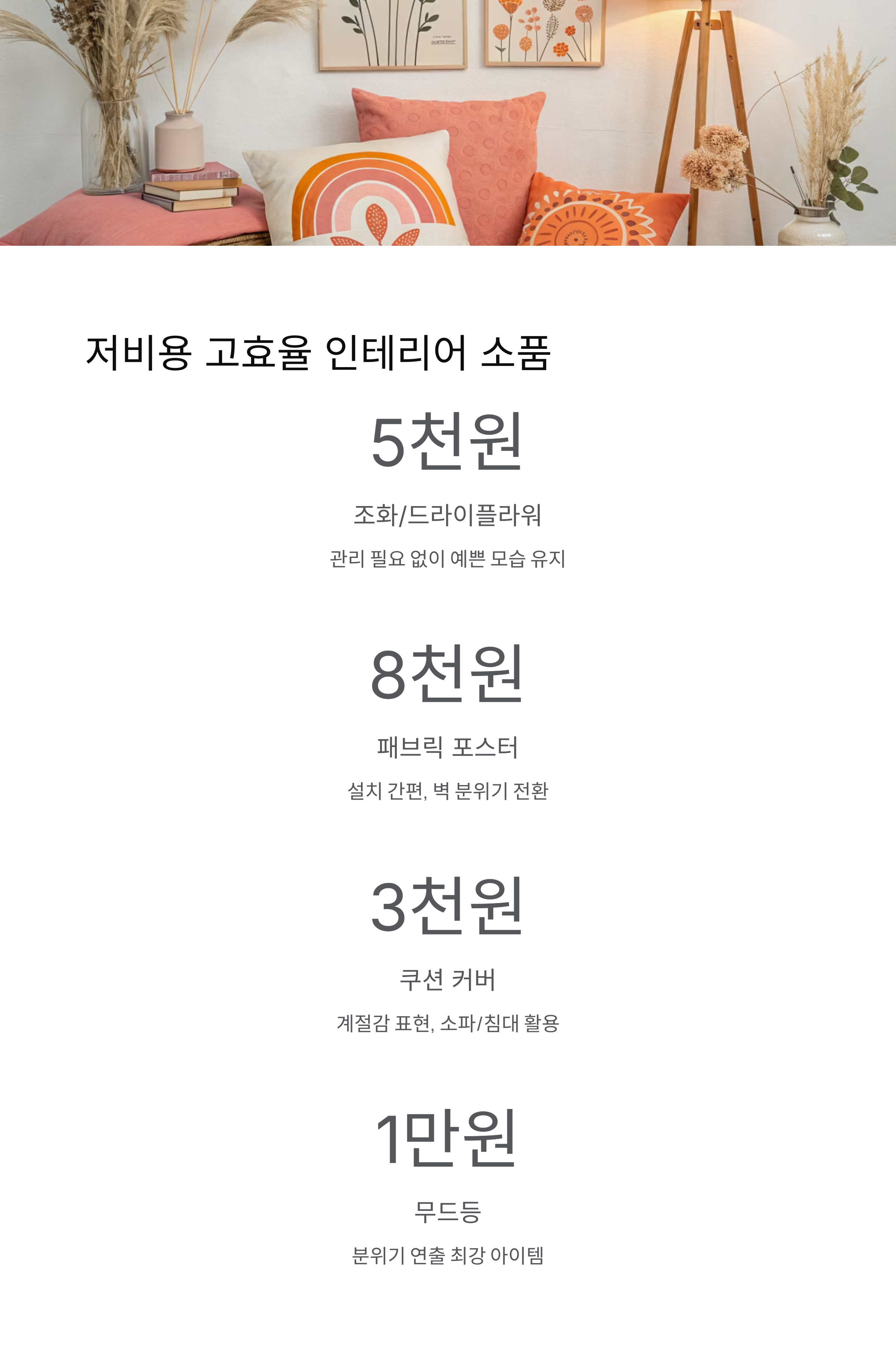 | 쿠션 커버 | 계절감 표현 용이 | 소파, 침대 | 3,000원~10,000원 |