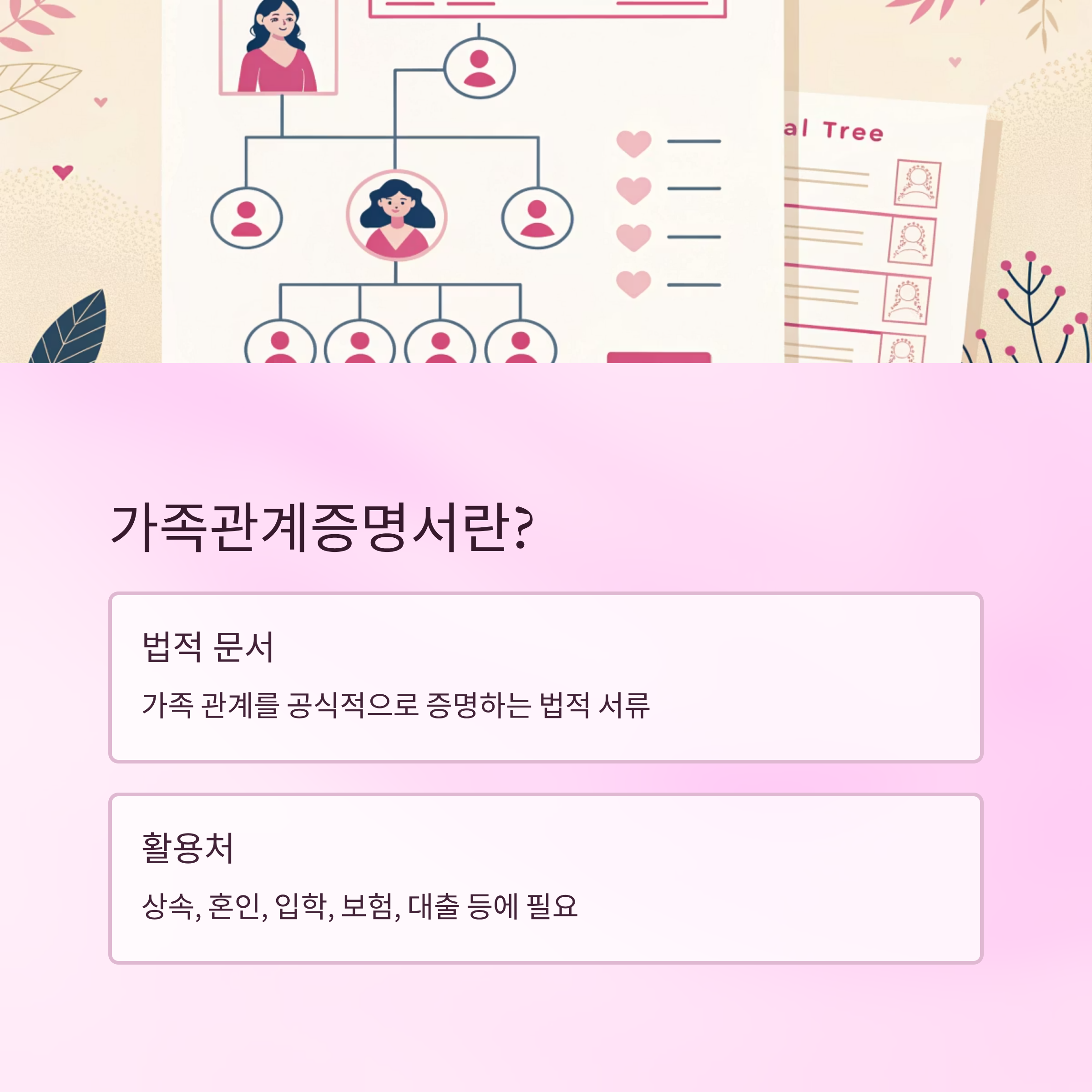 가족관계증명서는 개인의 가족 관계를 공식적으로 증명하는 법적 문서예요. 법원 전산망을 기반으로 발급되며, 부모, 배우자, 자녀 등 가족 구성원과의 관계를 표시해 주기 때문에 상속, 혼인, 입양, 보험, 학교 입학 등 다양한 상황에서 필요하죠. 이 서류는 대한민국 국민이면 누구나 발급받을 수 있고, 본인 외에도 가족관계가 확인되는 일부 친족이 발급할 수 있어요.