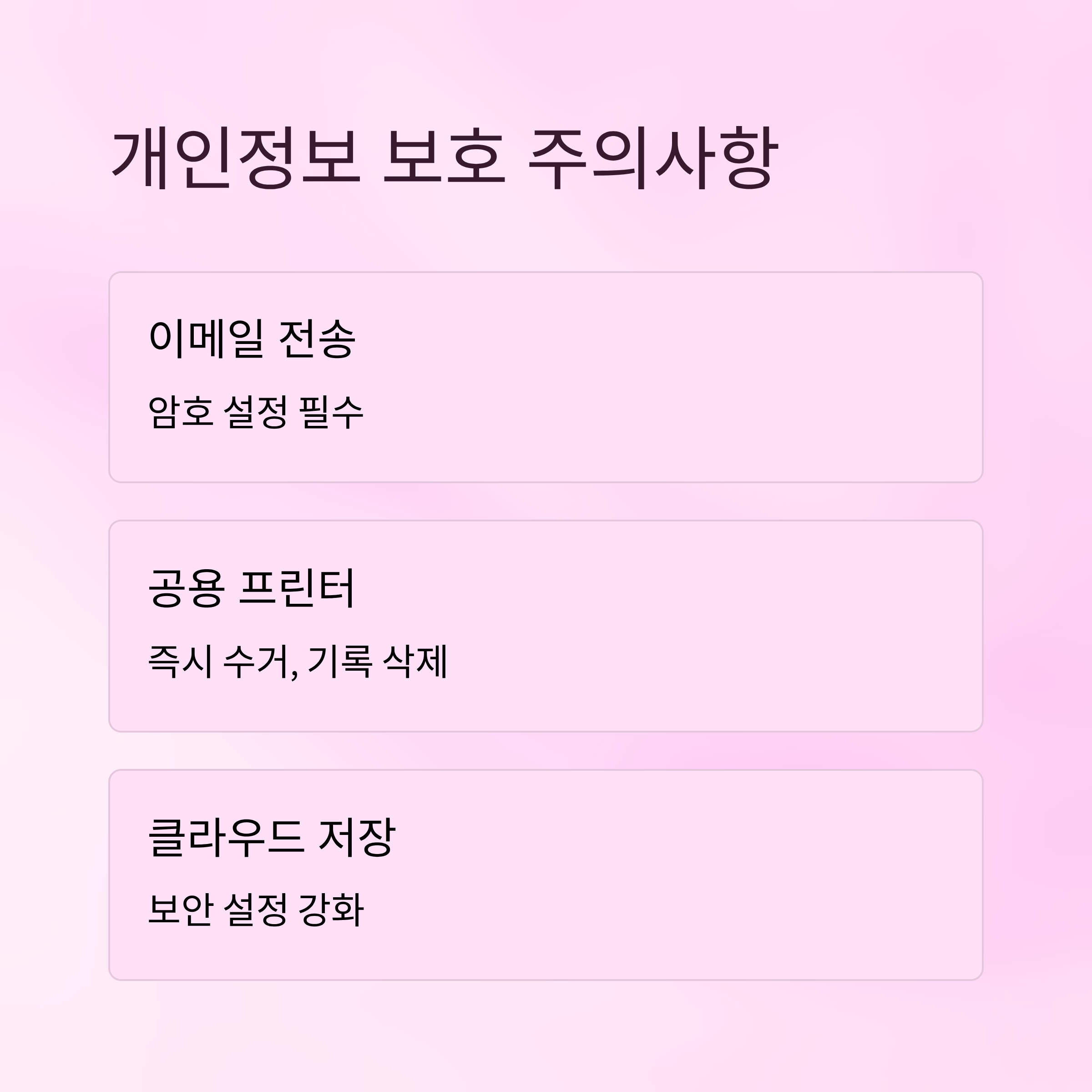 특히 이메일로 전송하거나 클라우드에 업로드할 경우, 반드시 암호를 설정해 두는 것이 안전합니다. 무심코 첨부 파일로 발송했다가 유출 사고로 이어질 수 있거든요.