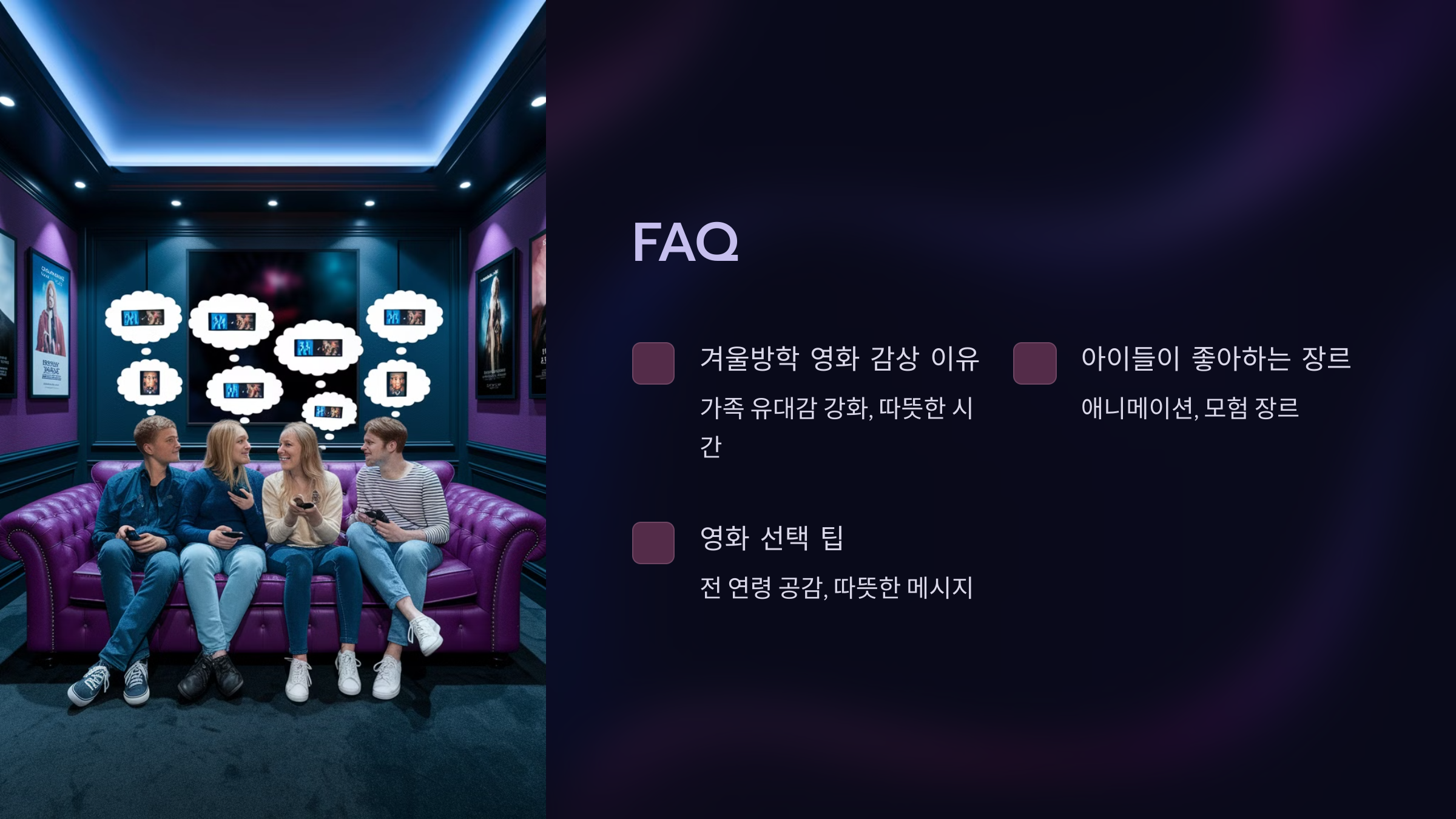 A1. 가족 간의 유대감을 강화하고 추운 날씨 속에서 따뜻한 시간을 보낼 수 있는 좋은 방법이에요. 영화는 함께 이야기하고 감정을 나누는 계기를 만들어 준답니다.