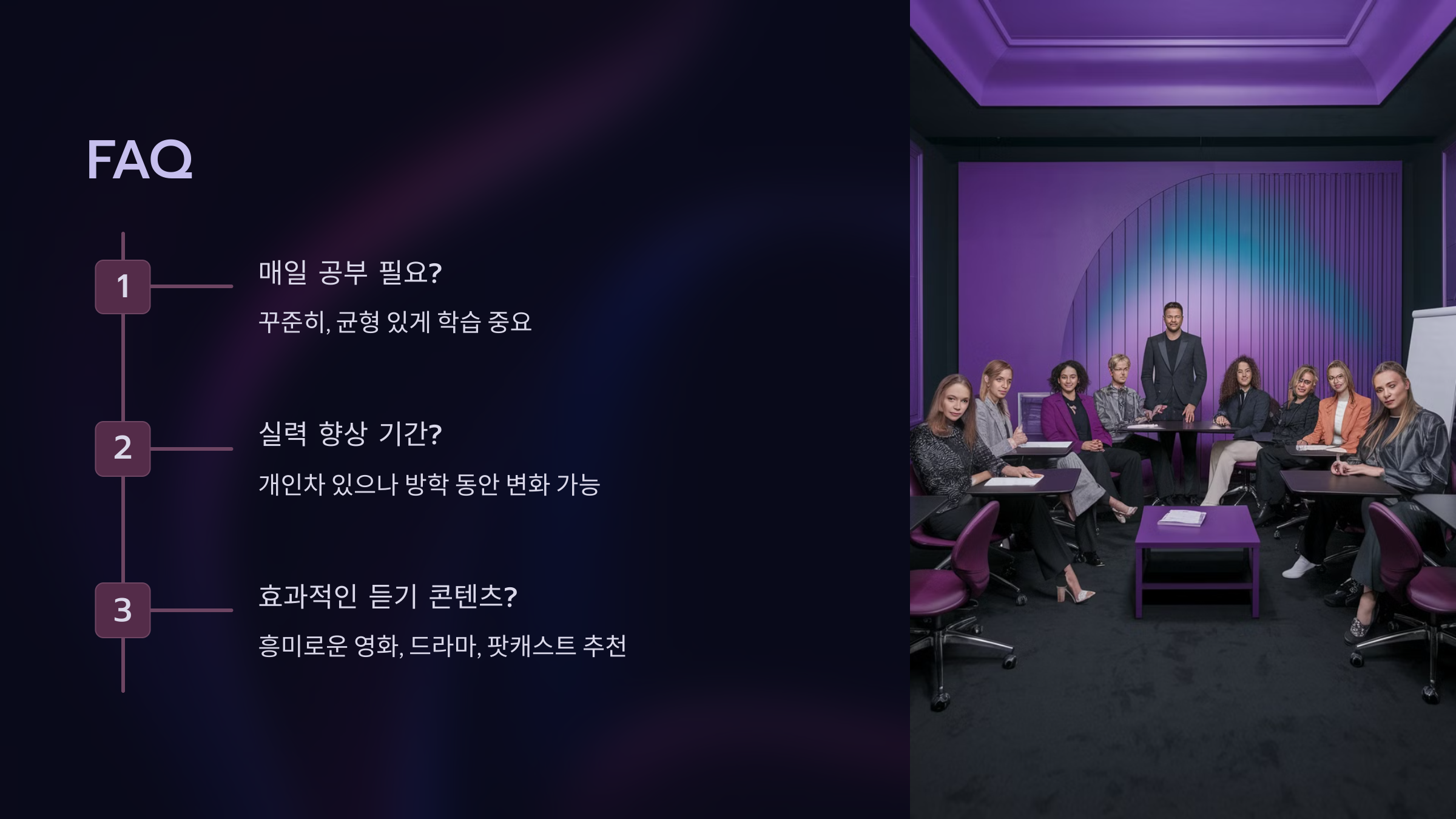 듣기 학습에서 중요한 것은 꾸준함이에요. 매일 정해진 시간을 투자해 지속적으로 학습하면 듣기 실력이 크게 향상될 거예요. 콘텐츠를 반복적으로 듣는 것도 큰 도움이 된답니다!