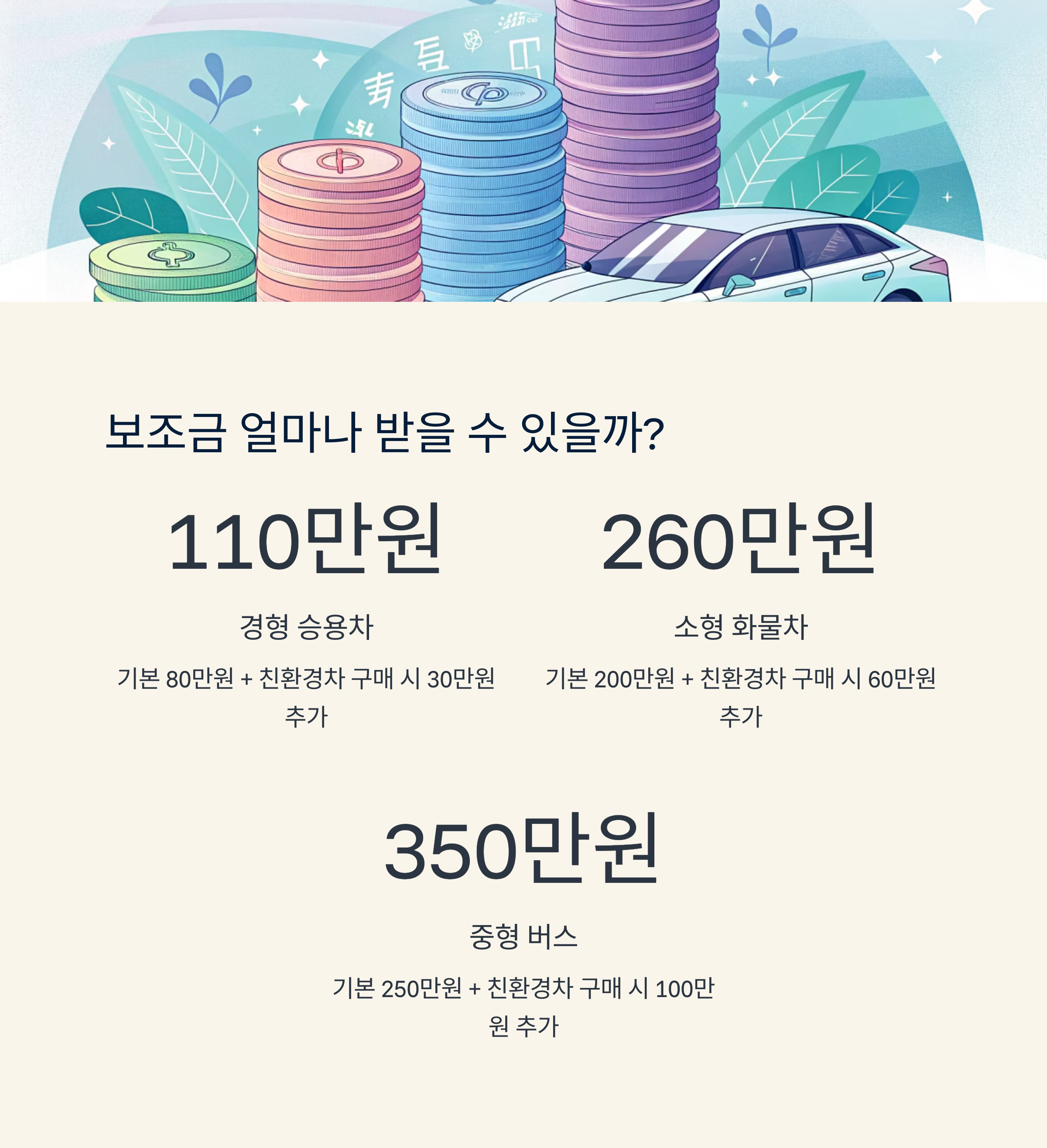 | 차량 종류 | 기본 지원금 | 추가 인센티브 (친환경차 구입 시) | 최대 지원금 |