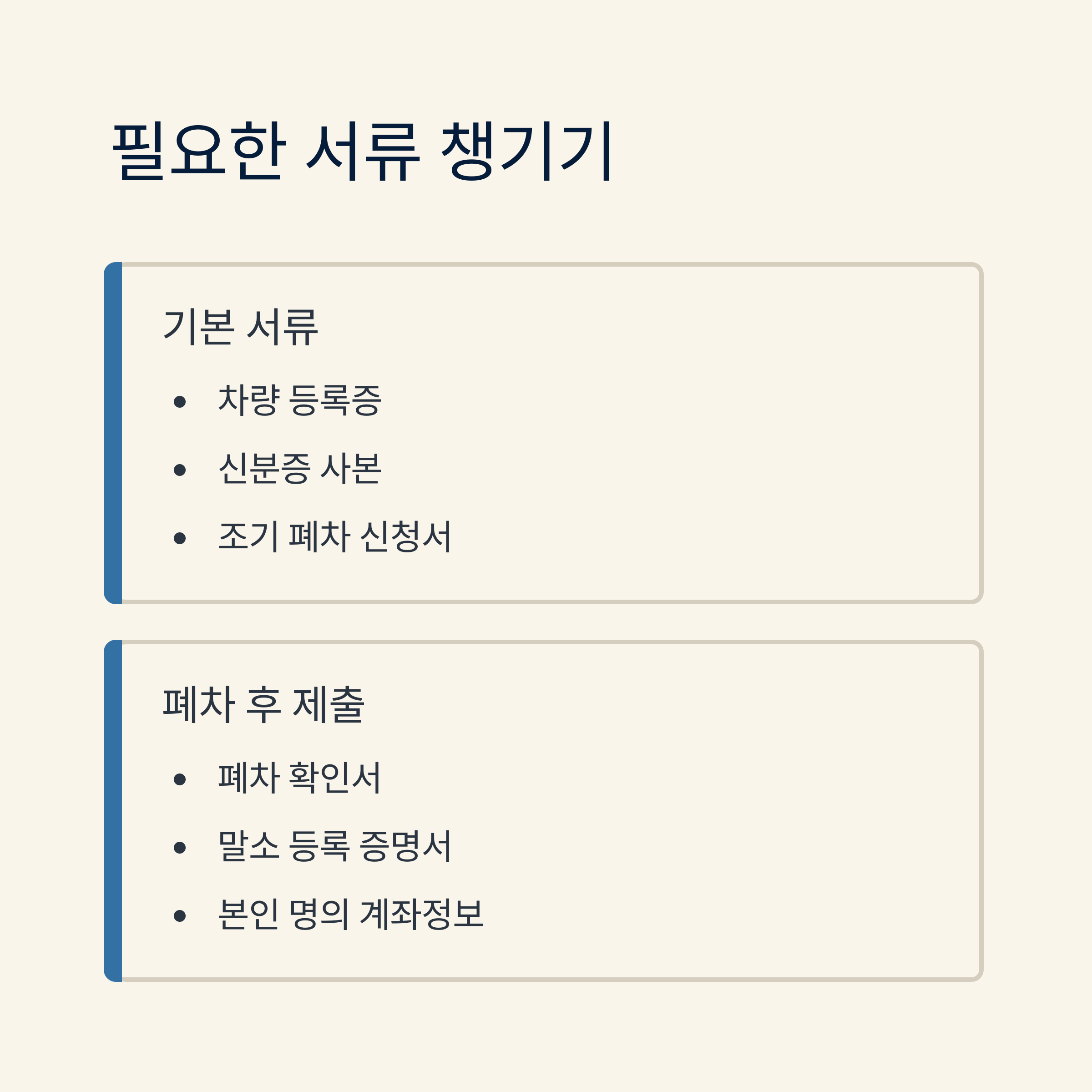 가장 기본이 되는 서류는 차량 등록증이에요. 등록증은 차량의 소유자 정보, 차량 정보가 정확히 기재된 서류로, 폐차 및 말소 등록 시 반드시 필요해요. 그리고 차량 소유자의 신분증 사본도 함께 제출해야 해요. 온라인 신청 시에는 스캔본 또는 고화질 사진으로 제출 가능해요.