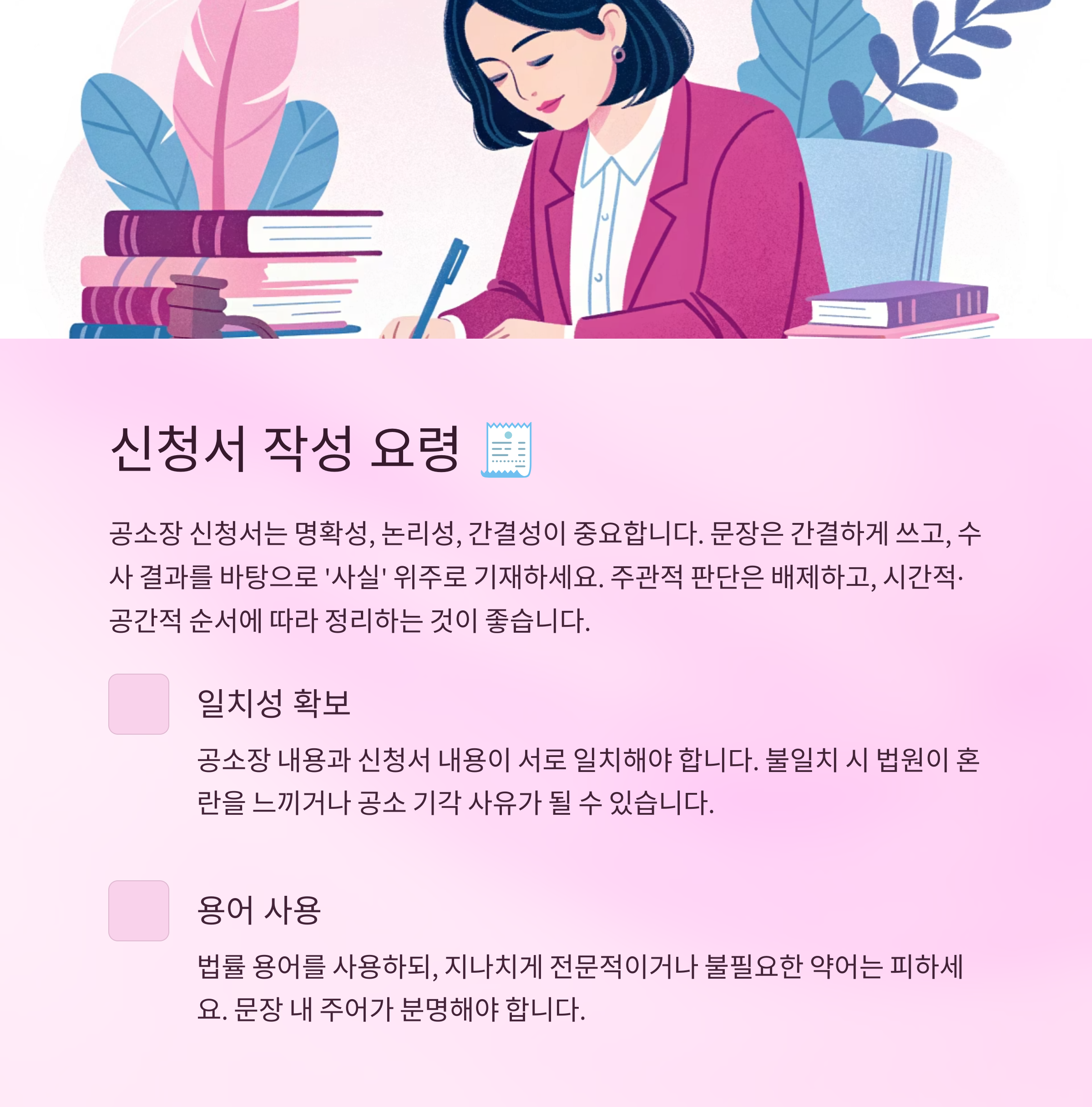 공소장 내용과 신청서 내용이 서로 일치하도록 맞추는 것도 중요해요. 만약 신청서 요약과 공소장의 원문 내용이 다르면, 법원이 혼란을 느끼거나 공소 기각 사유가 될 수도 있어요.