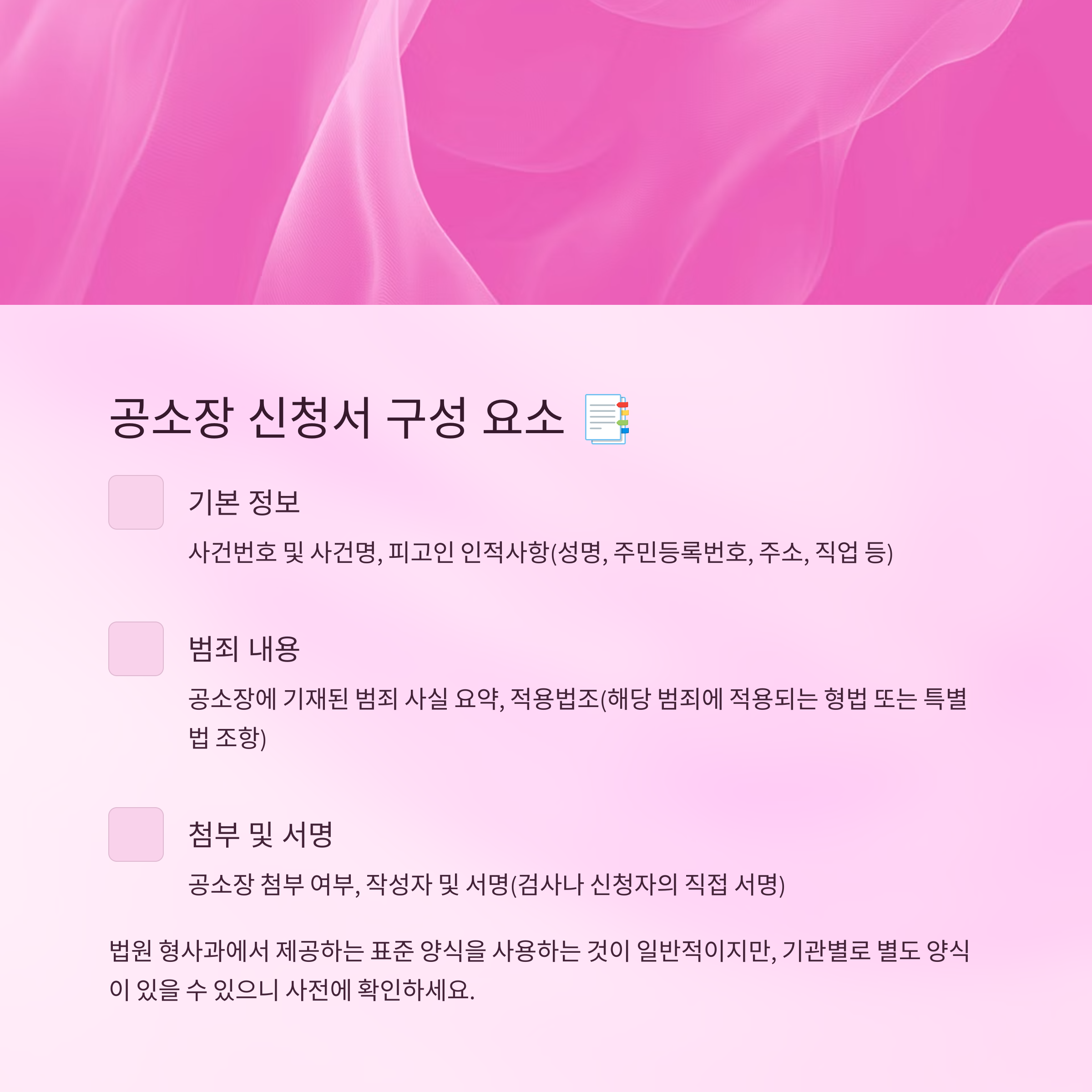 공소장 신청서를 쓸 때 초보자들이 자주 하는 실수 중 하나는 '범죄사실 요약'에서 날짜나 피해액 등 중요한 수치를 누락하는 거예요. 이건 실제로 접수 거절 사유가 되기도 해요.