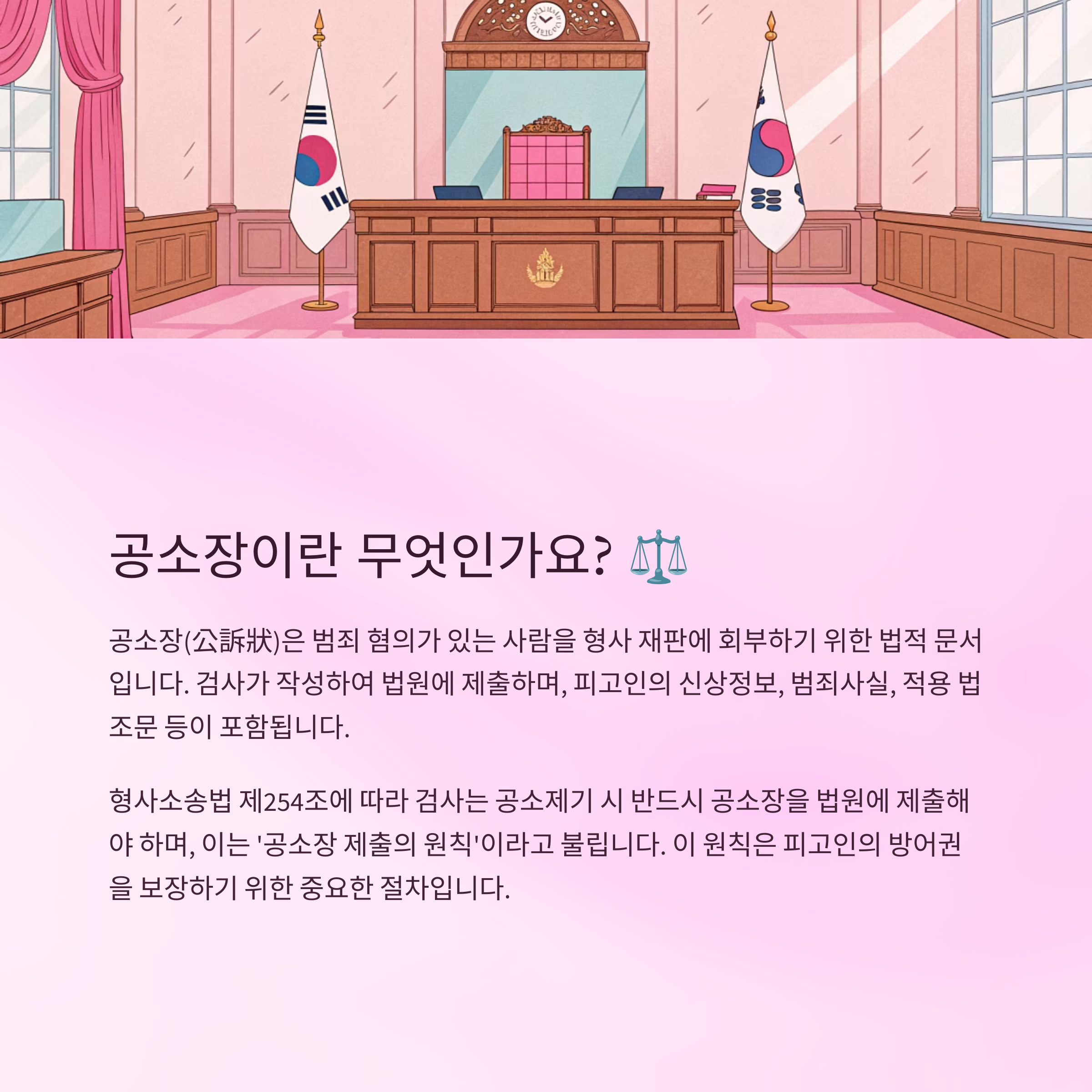 공소장(公訴狀)은 범죄 혐의가 있는 사람을 형사 재판에 회부하기 위한 법적 문서예요. 보통 검사가 작성하고 법원에 제출하는 형식이에요. 내용에는 피고인의 신상, 범죄사실, 적용 법조문 등이 포함되며, 이 문서를 기반으로 재판이 진행돼요.