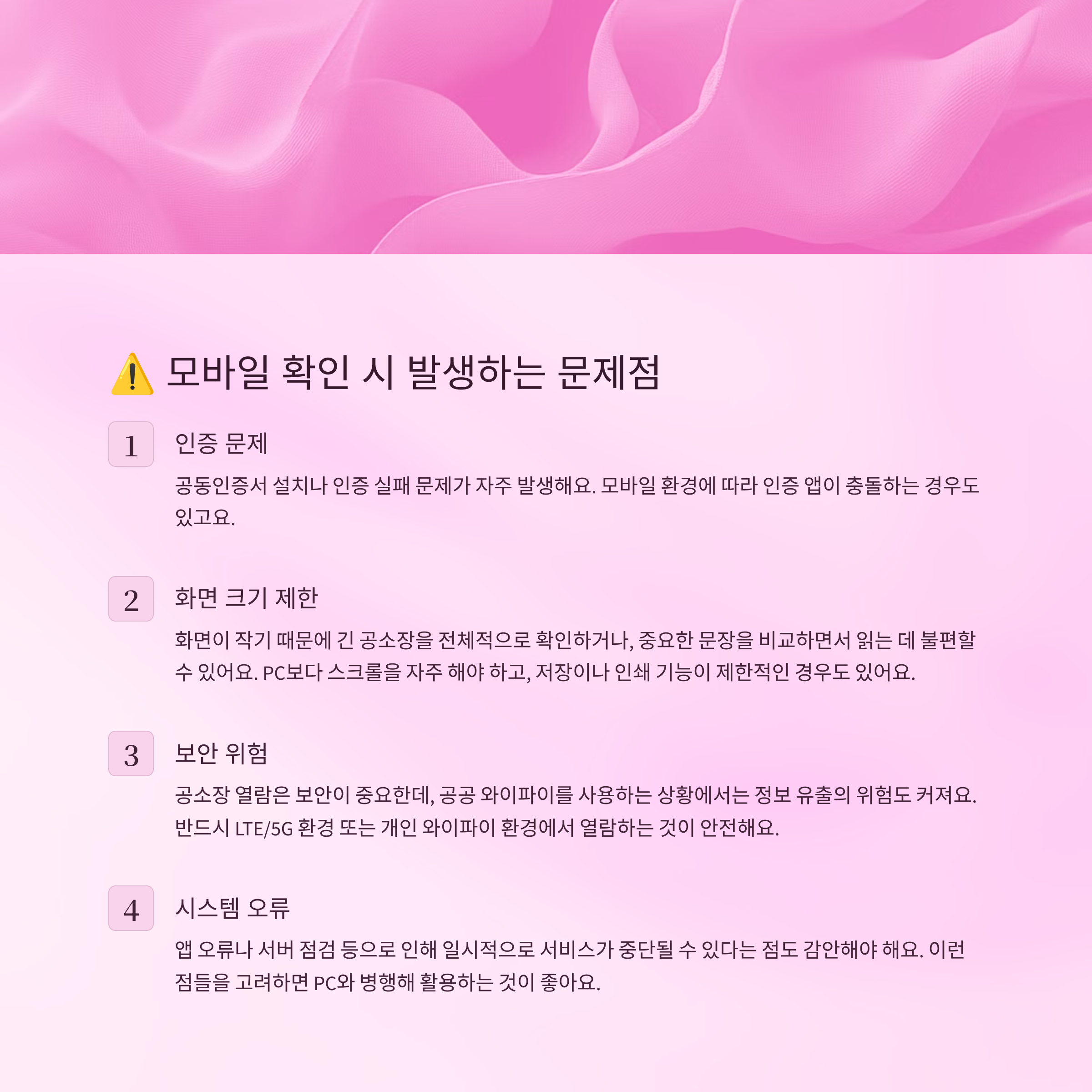 모바일로 공소장을 확인할 수 있어서 편리한 점도 많지만, 그만큼 한계점도 분명히 존재해요. 예를 들어, 공동인증서 설치나 인증 실패 문제가 자주 발생해요. 모바일 환경에 따라 인증 앱이 충돌하는 경우도 있고요.