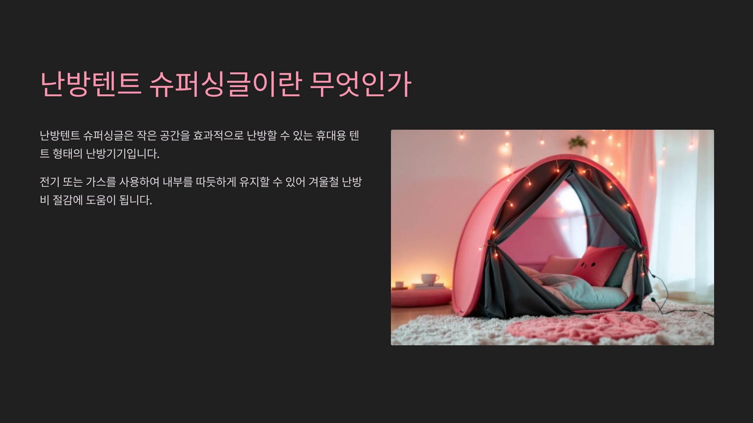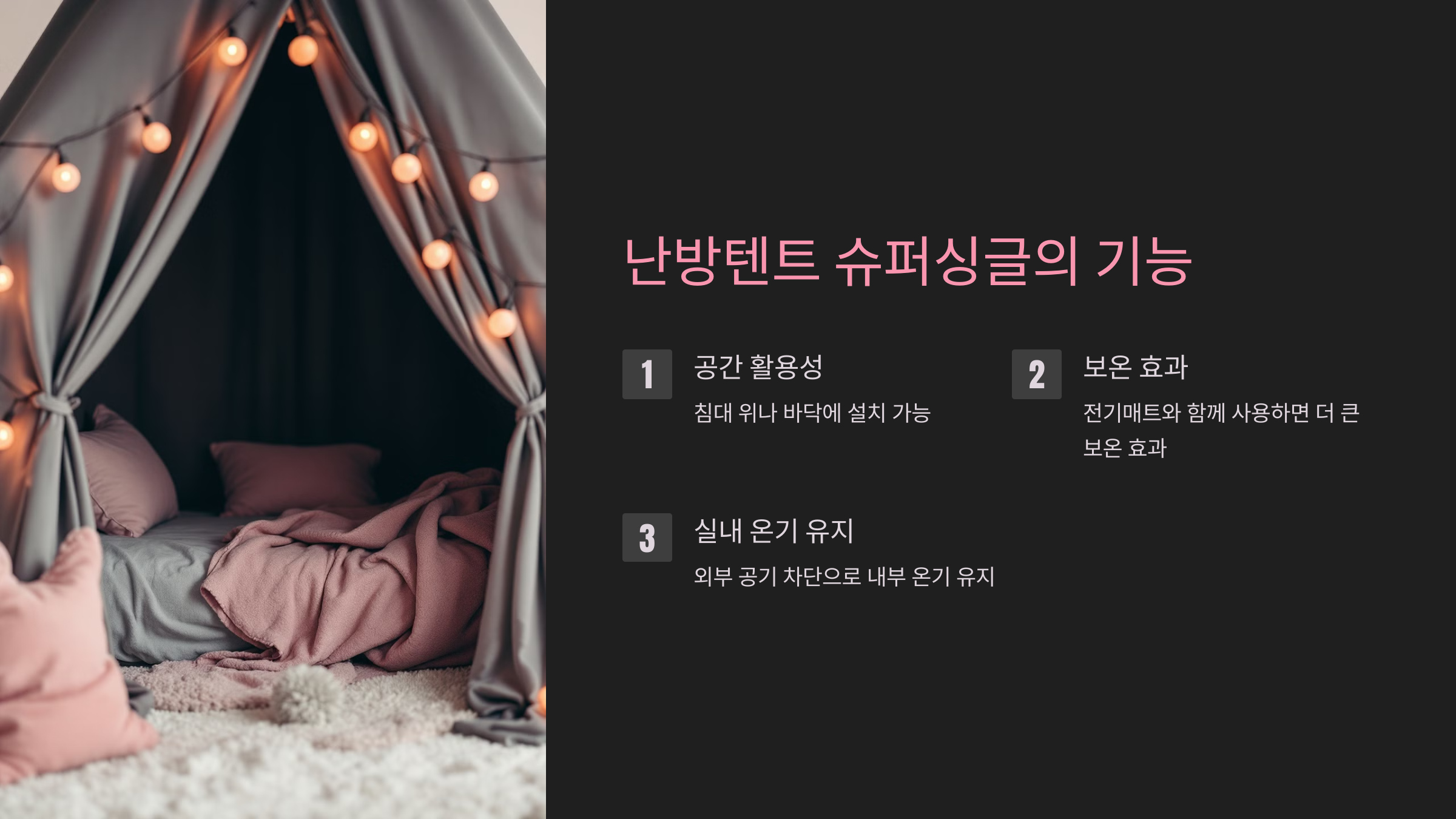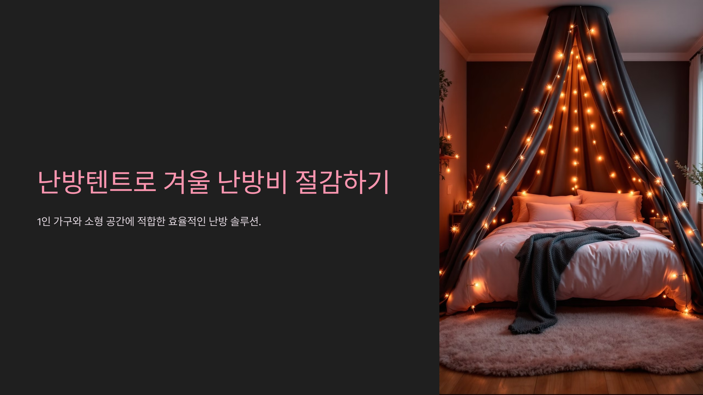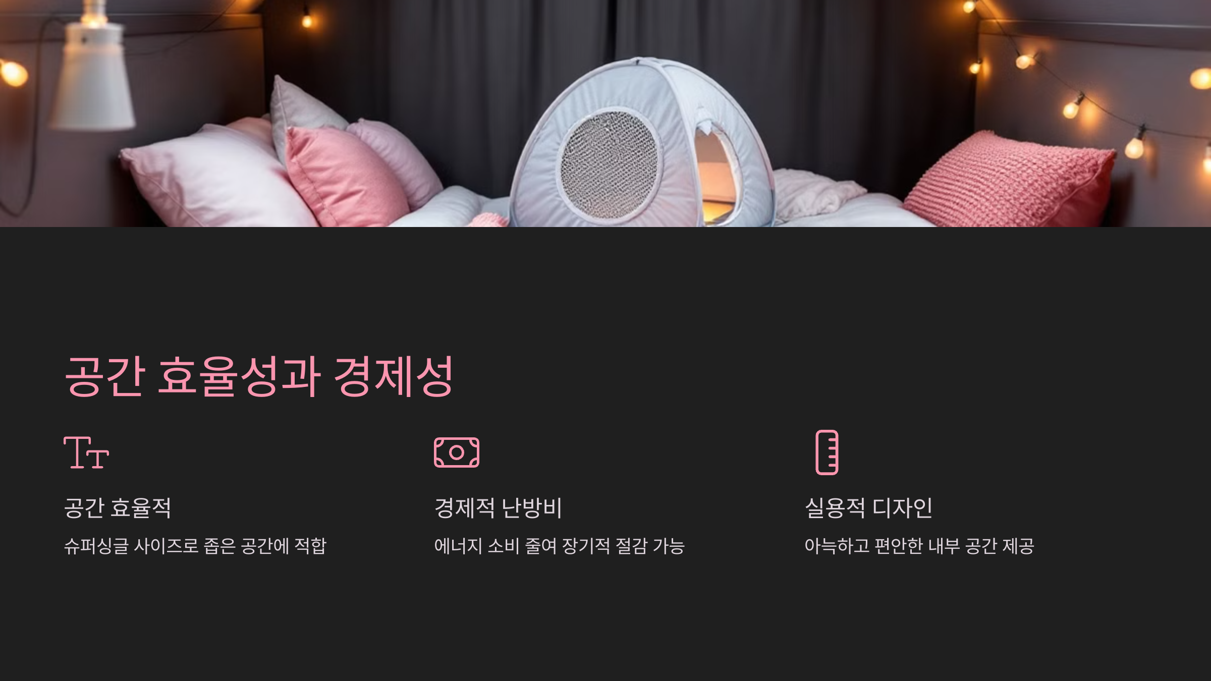겨울철 난방비 걱정을 덜면서 따뜻한 실내 환경을 만들고 싶다면 효율적인 난방 솔루션이 필요합니다. 난방텐트 슈퍼싱글은 특히 1인 가구나 소형 공간에서 탁월한 효과를 발휘하는 실내 난방 아이템으로, 침대 위나 바닥에 간편하게 설치할 수 있는 것이 특징입니다. 이 제품은 기존 난방기구와 함께 사용하면 온기를 효과적으로 유지하고, 난방비를 크게 절감할 수 있어 겨울철 필수템으로 자리 잡고 있습니다.