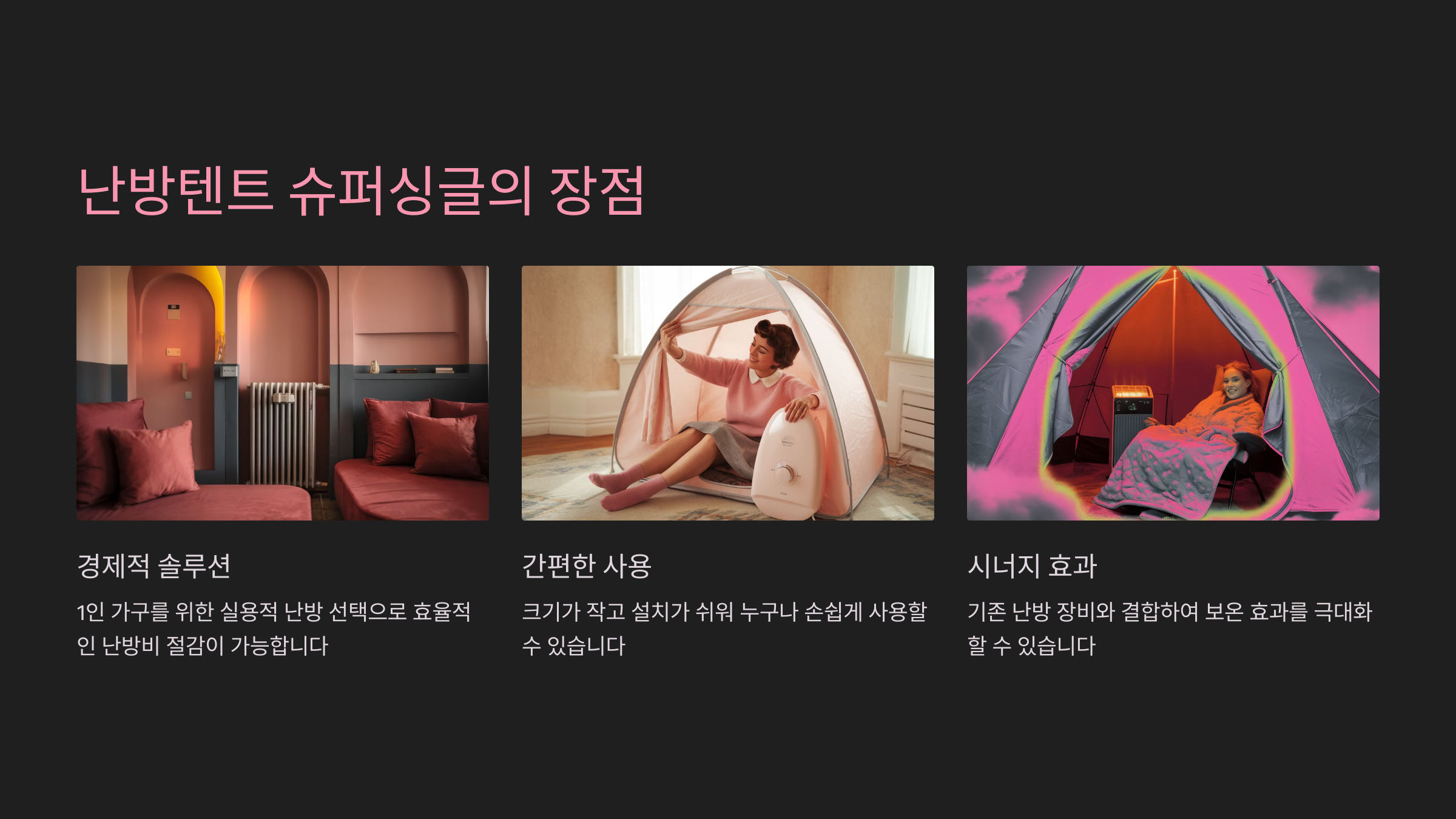난방텐트 슈퍼싱글은 특히 1인 가구를 위한 경제적이고 실용적인 난방 솔루션입니다. 크기가 아담하고 설치가 간편해 누구나 쉽게 사용할 수 있으며, 기존 난방 장비와 결합하면 시너지 효과를 발휘합니다.