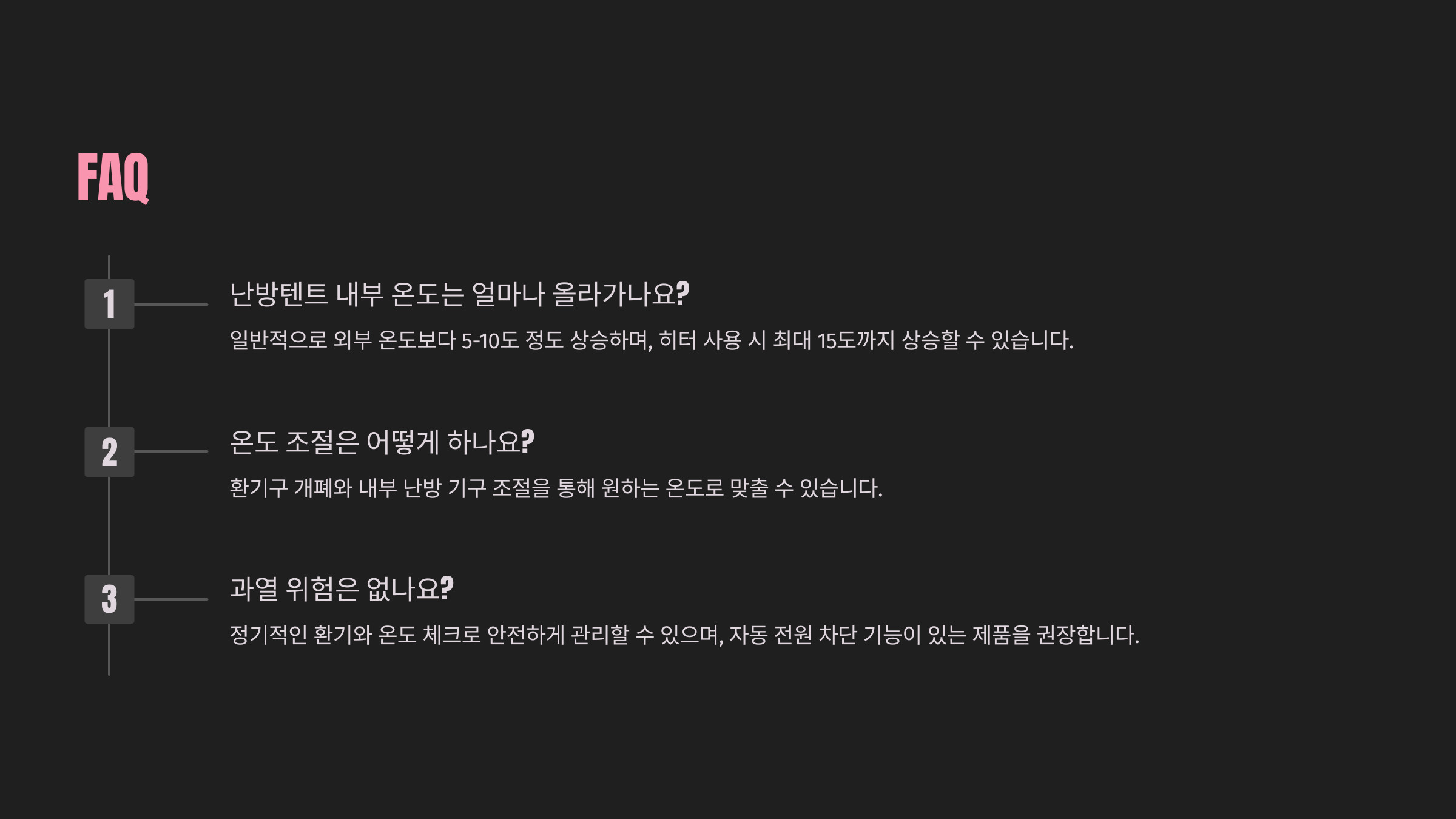 A1. 텐트 내부에서 온기를 가두기 때문에 평균 3~5도의 온도 상승 효과를 기대할 수 있습니다.