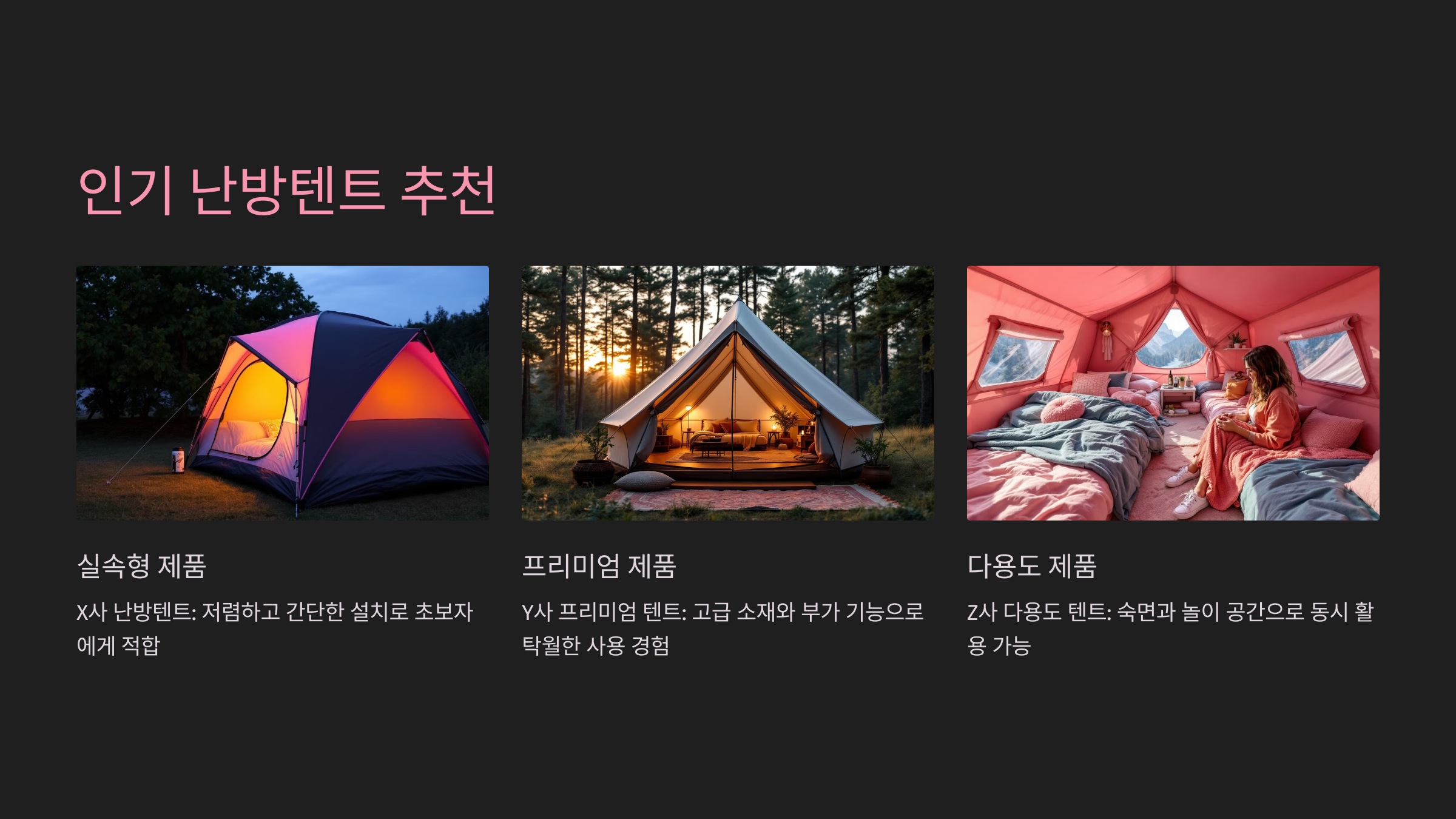 - X사 난방텐트: 저렴한 가격과 간단한 설치 방식으로 초보 사용자에게 적합합니다.
