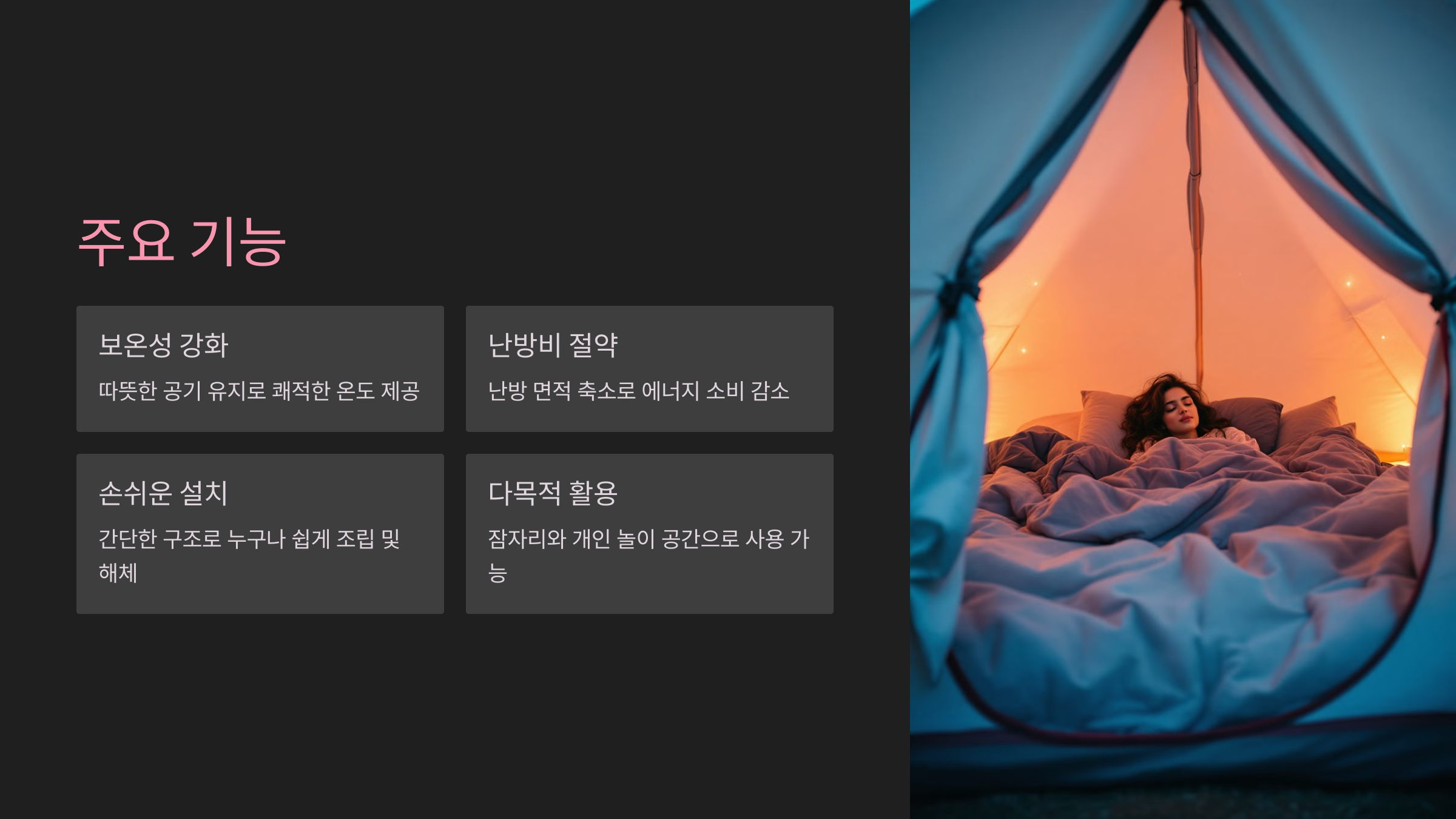 - 보온성 강화: 텐트 내부에서 따뜻한 공기를 유지해 쾌적한 온도를 제공합니다.