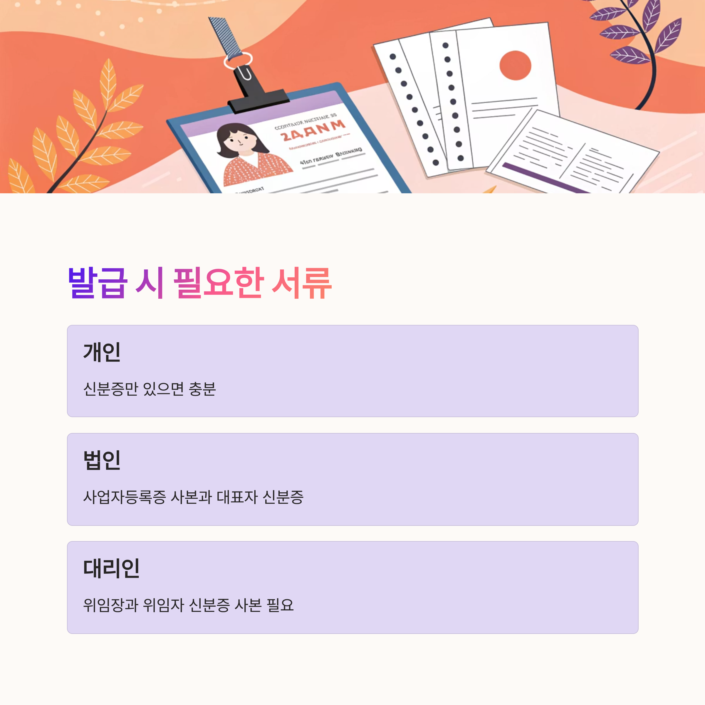 개인 신청자는 신분증 하나면 충분해요. 하지만 법인이나 단체는 사업자등록증 사본과 대표자 신분증이 필요할 수 있어요. 대리인이 발급받을 경우 위임장과 위임하는 사람의 신분증 사본을 함께 준비해야 합니다.