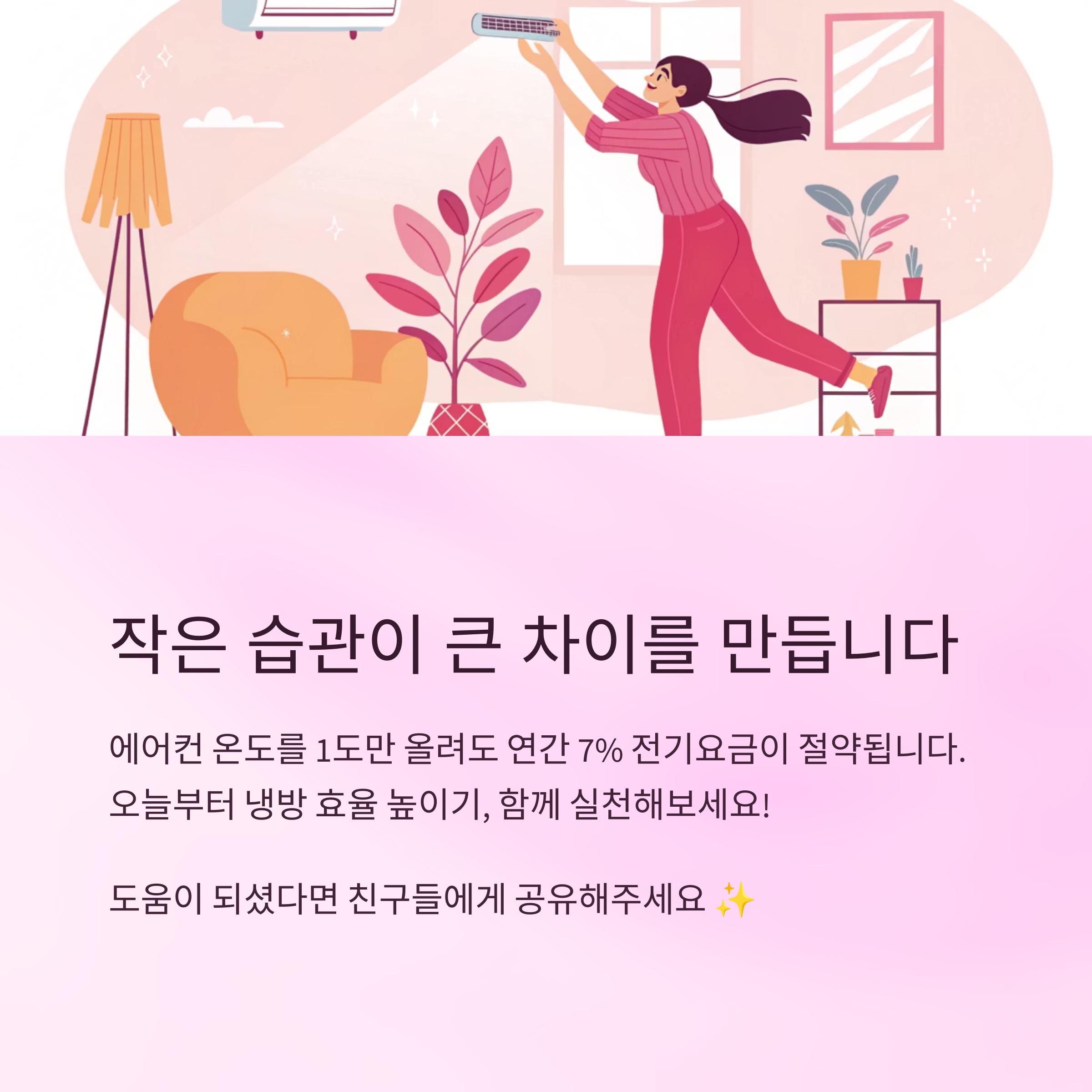 냉방은 에어컨 성능에만 의존하지 않아요. 우리의 습관이 냉방 효율을 결정해요. 조금만 의식적으로 실천하면, 시원함도 챙기고 전기요금도 아낄 수 있어요! 오늘부터 바로 실천해볼까요? 😊