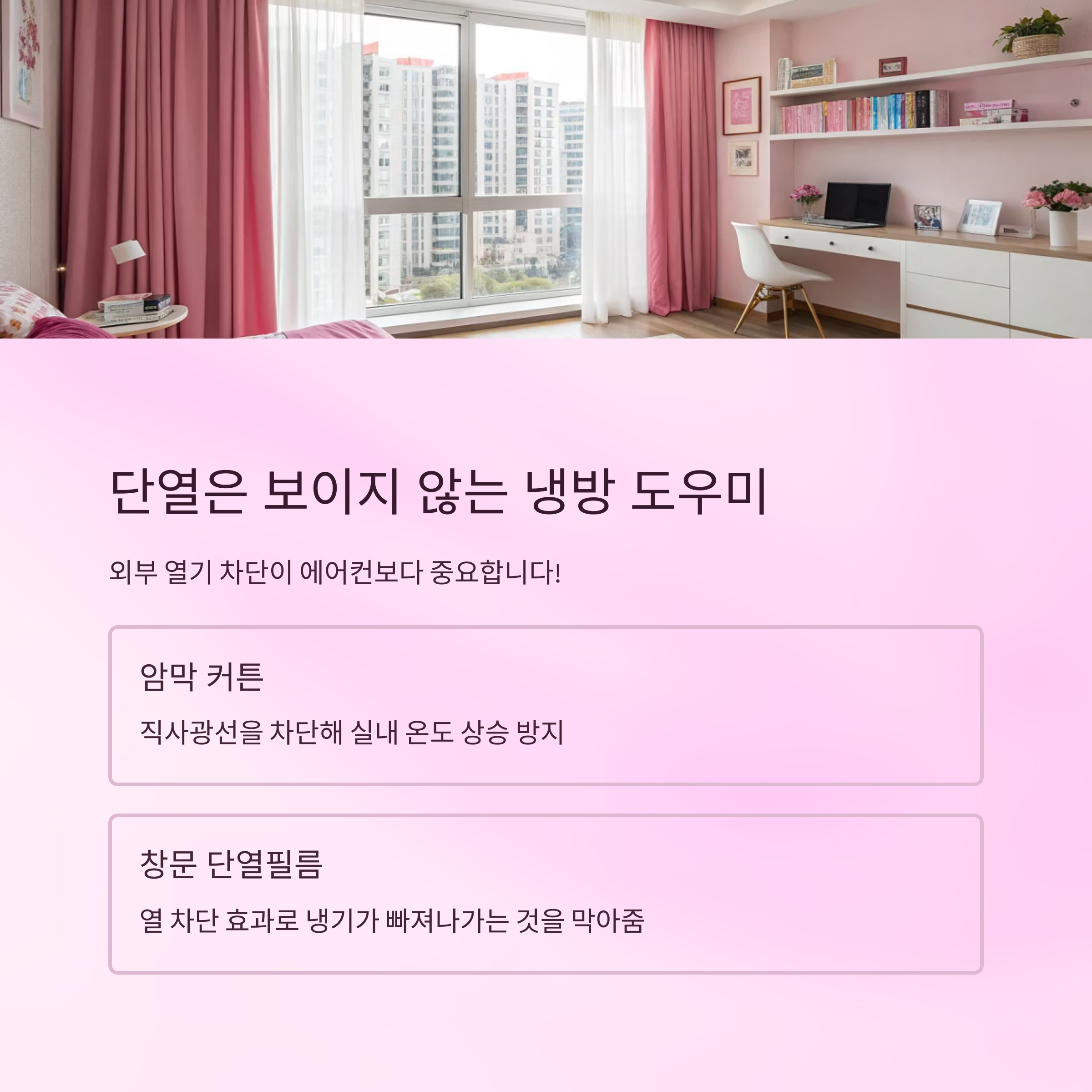 | 창문 | 단열 필름, 암막 커튼 | 햇빛 차단, 열기 유입 감소 |