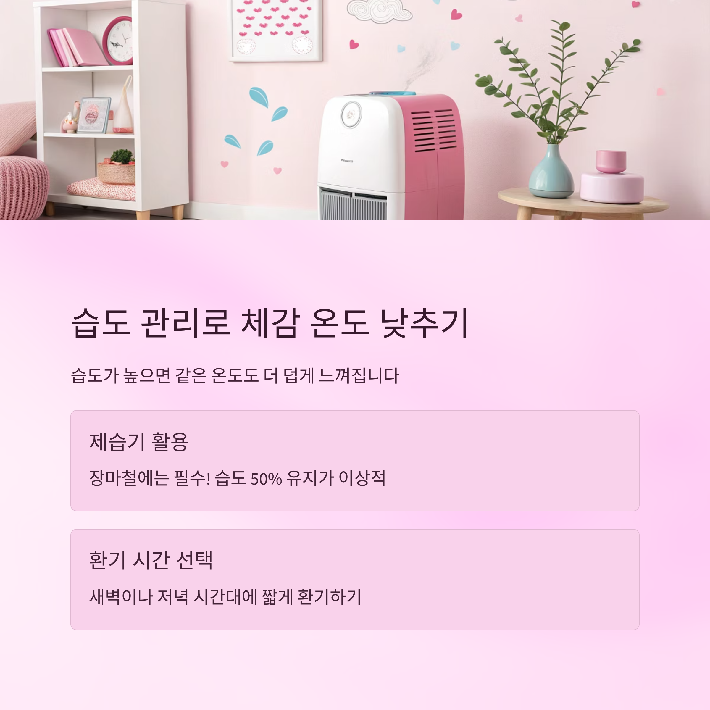 | 제습기 | 습도 감소, 체감 온도 낮춤 | 장마철, 고습 환경 |