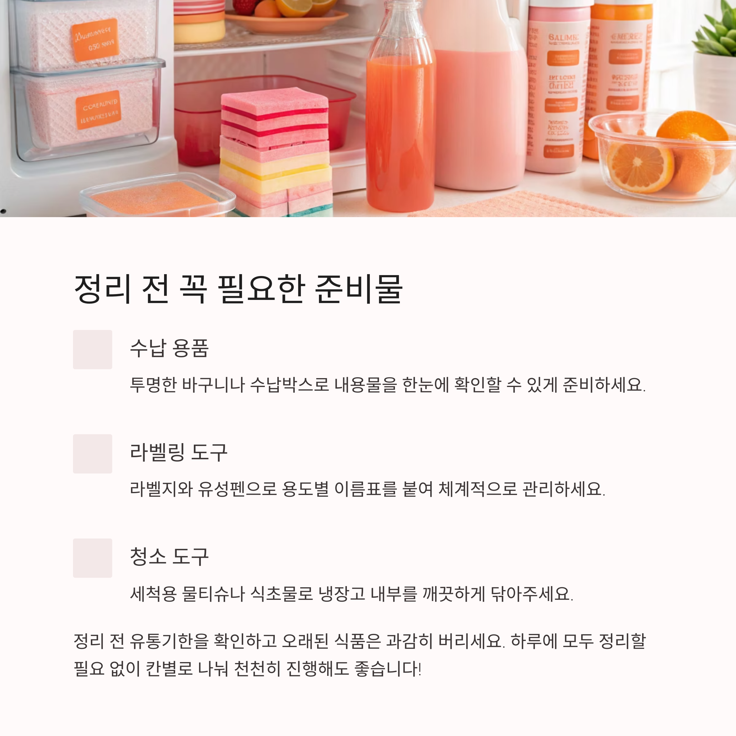 냉장고 정리는 대청소처럼 하루에 끝낼 필요는 없어요. 섹션별로 나눠서, 예를 들면 오늘은 상칸, 내일은 중간 칸 이런 식으로 천천히 해도 충분히 효과를 볼 수 있답니다!
