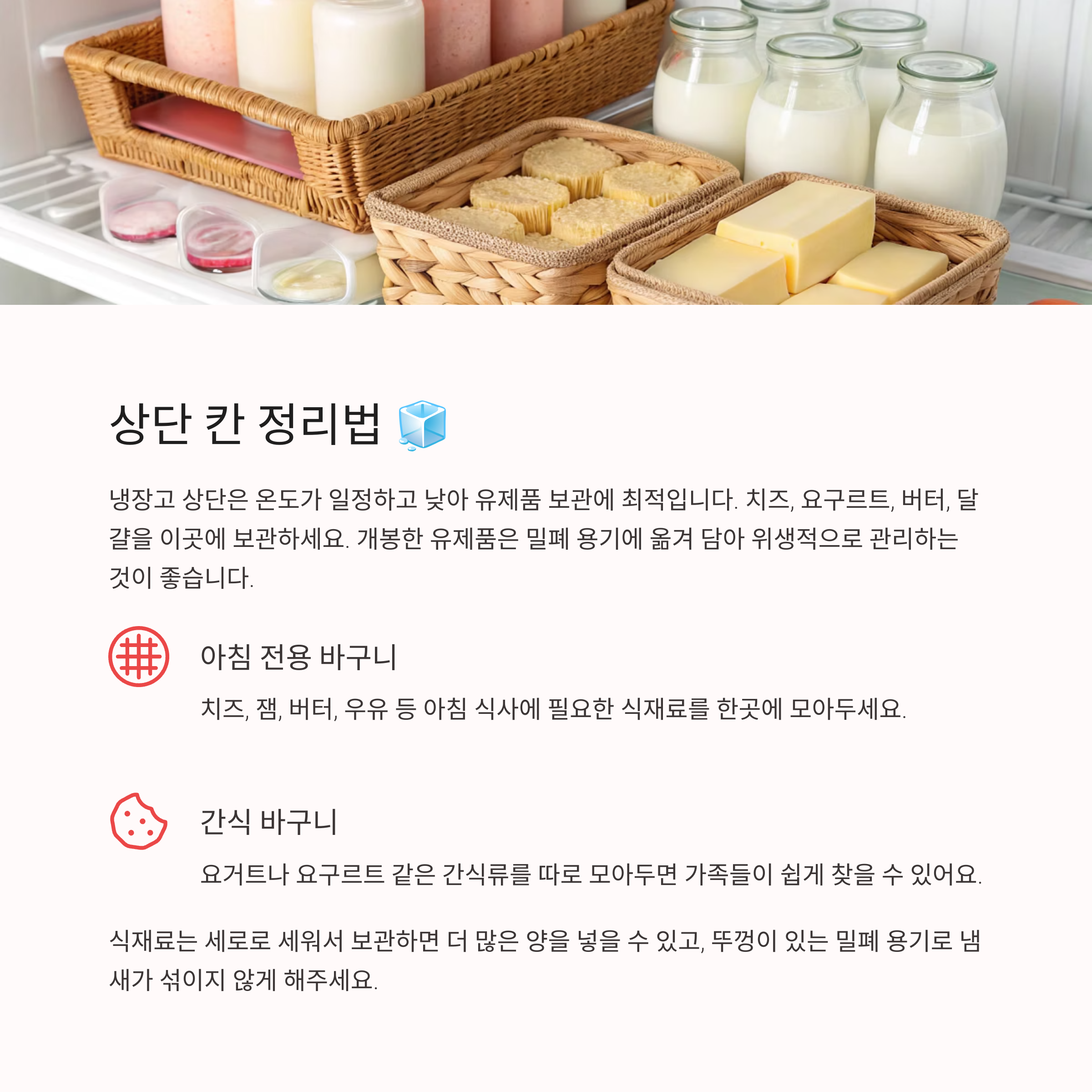 냉장고의 상단 칸은 비교적 온도가 일정하고 낮은 편이라 유제품 보관에 적합해요. 치즈, 요구르트, 버터, 달걀 같은 식재료를 여기에 두면 신선하게 보관할 수 있죠. 다만 포장을 개봉한 유제품은 전용 밀폐 용기에 옮겨 담는 게 위생적으로도 좋아요.