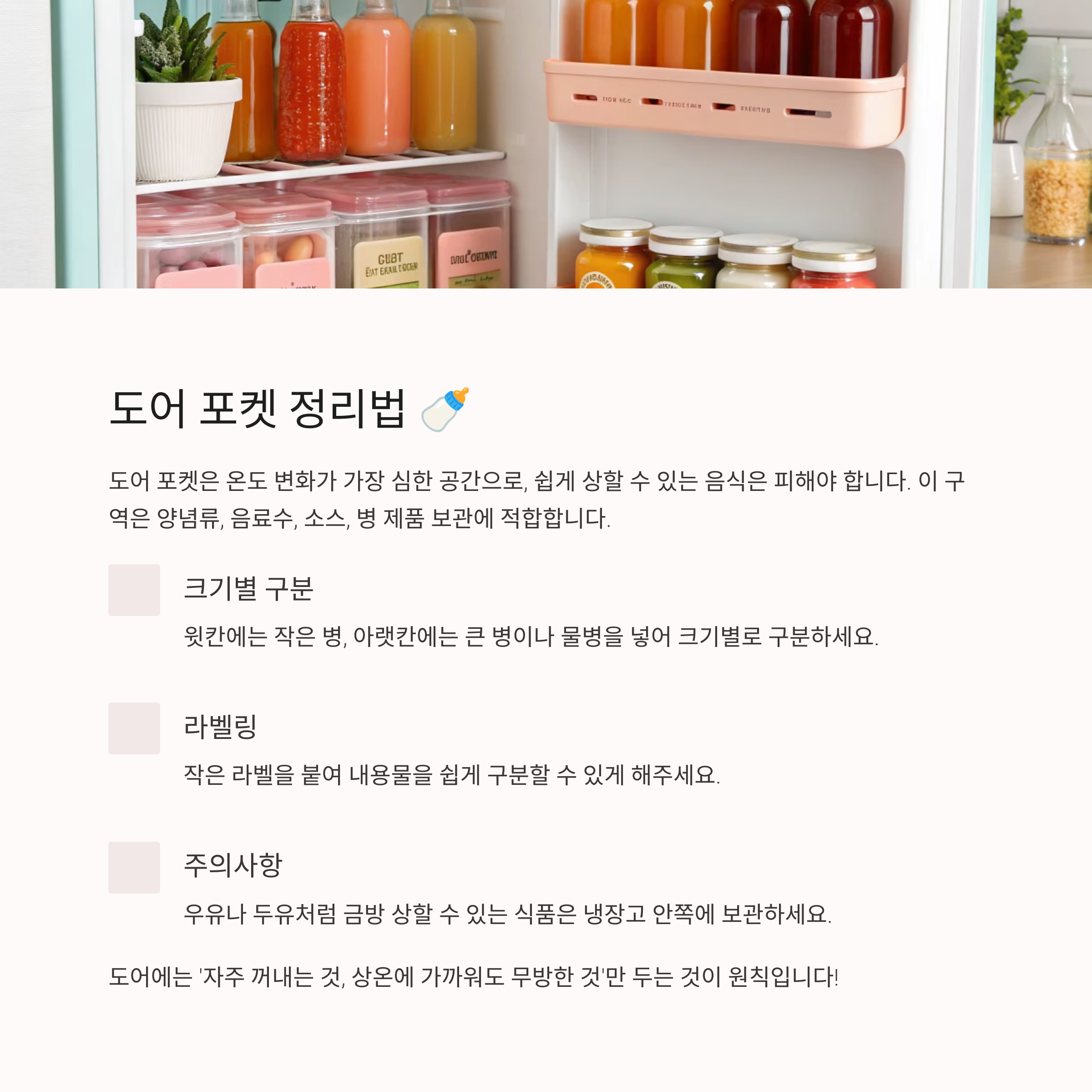 도어 포켓은 냉장고 중에서도 온도 변화가 가장 심한 공간이에요. 문을 여닫을 때마다 외부 공기가 들어오기 때문에 상온에 가까워지기 쉬워요. 그래서 쉽게 상할 수 있는 음식은 이 칸에 두면 안 된답니다.