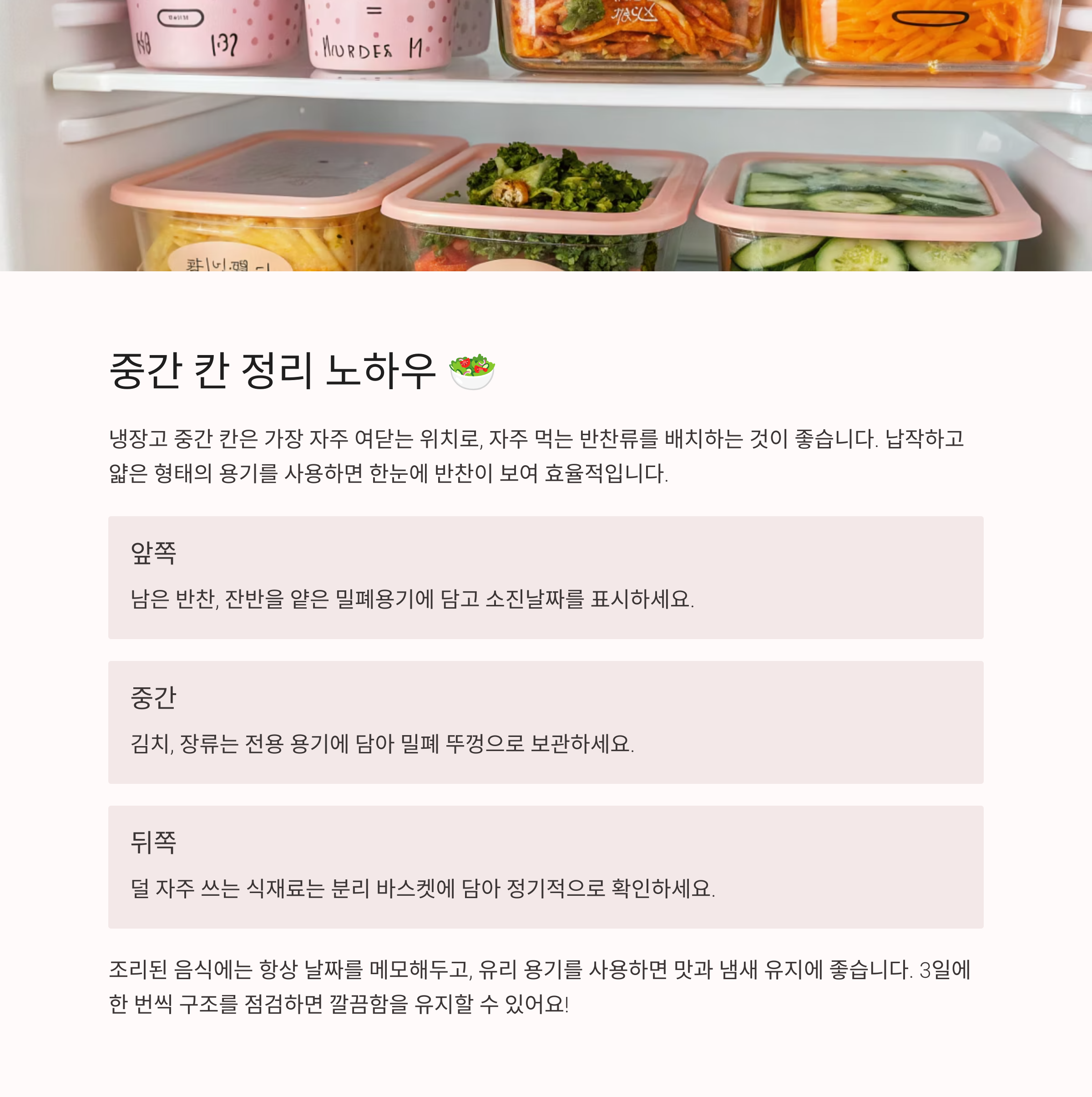 이제 냉장고 속에서도 ‘공간의 질서’를 만들 수 있어요. 눈에 보이는 것부터 차근차근 정리해나간다면, 매일의 식사 준비도 한결 편하고 즐거워질 거예요! 🍽