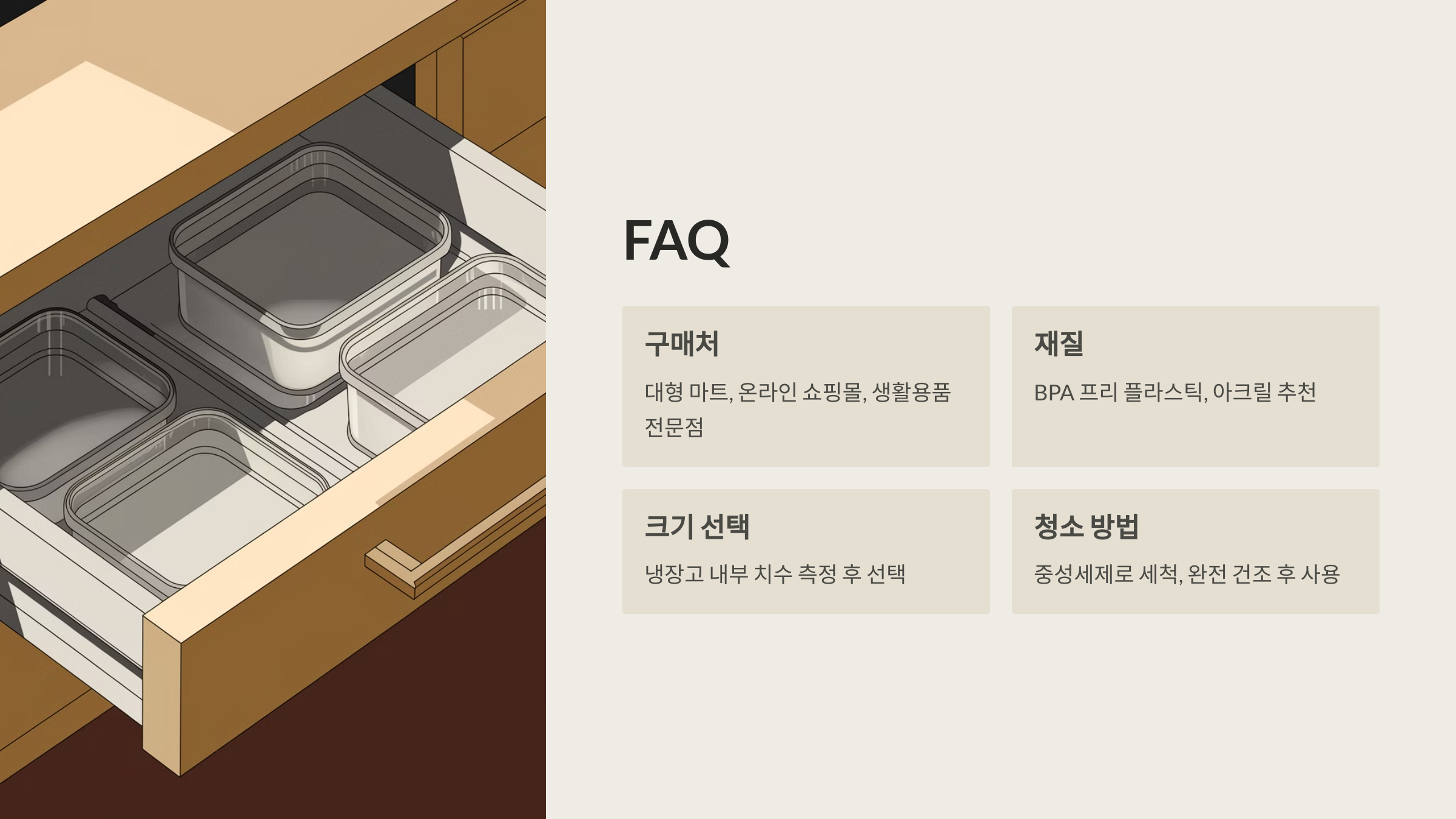 A4. 냉장고 내부 치수를 측정해 여유 공간이 남지 않도록 선택하는 것이 좋아요.
