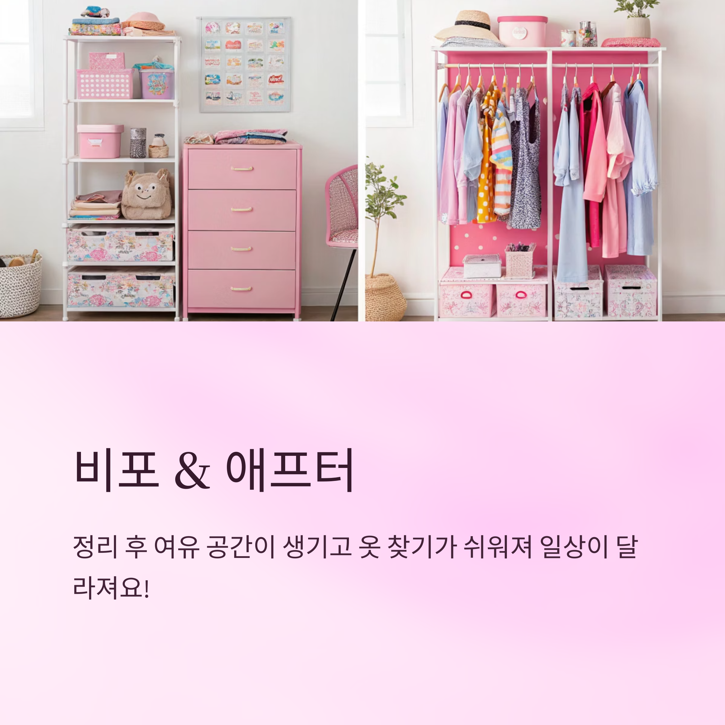 Before 상태에서는 옷들이 뒤섞여 있고, 찾는 데 시간이 오래 걸렸어요. 그런데 수납박스를 활용하고, 옷걸이를 교체한 후에는 모든 옷이 한눈에 보이고 정리도 간편했죠. 가장 인상 깊었던 건 옷장이 작아졌나 싶을 정도로 여유 공간이 생겼다는 점이에요.