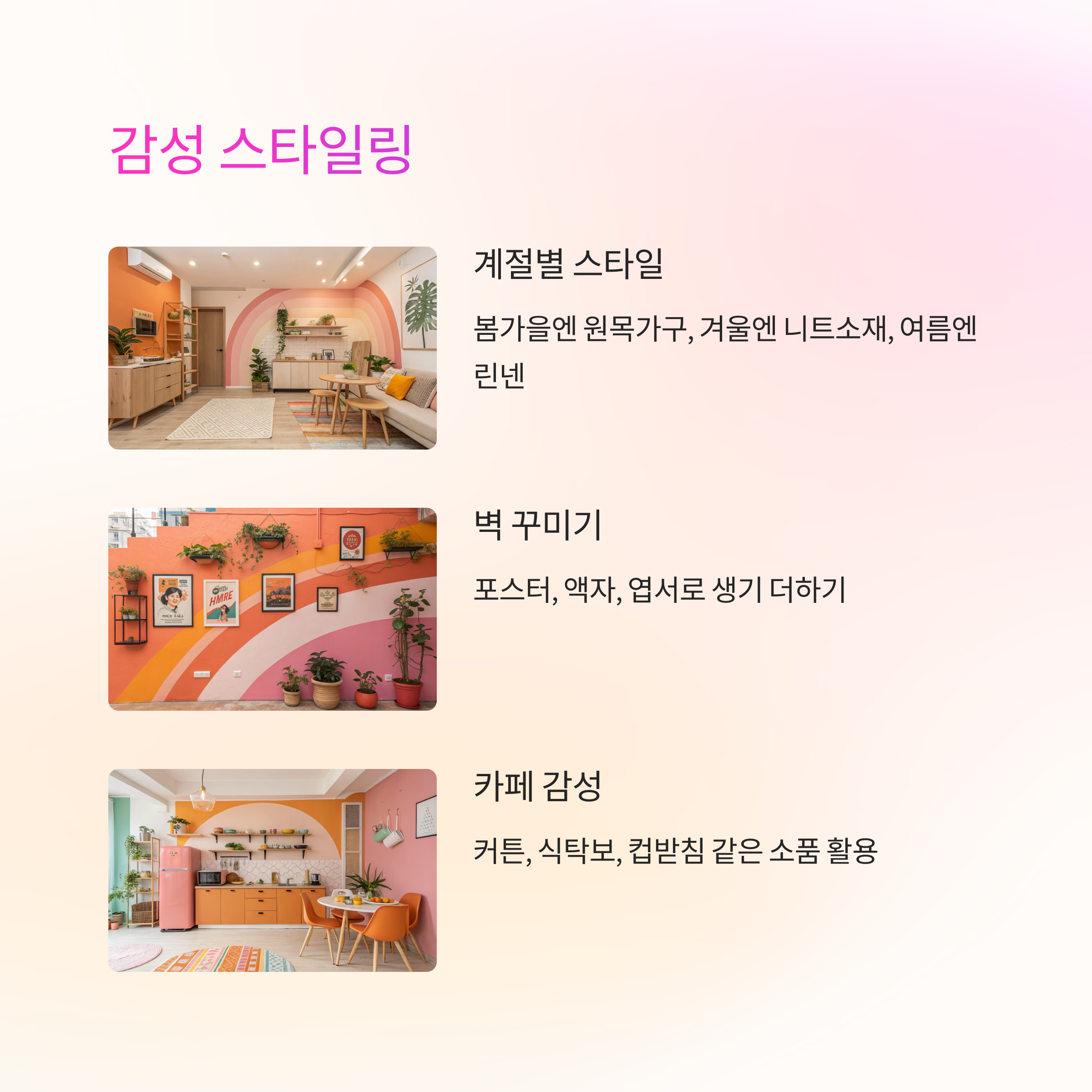 감성적인 자취방을 만들고 싶다면, 스타일을 정하는 게 먼저예요. 내 취향이 '모던', '빈티지', '내추럴', '북유럽', '러블리' 중 어디에 가까운지를 파악한 다음, 그 스타일에 맞는 아이템을 하나씩 모아보는 거죠.