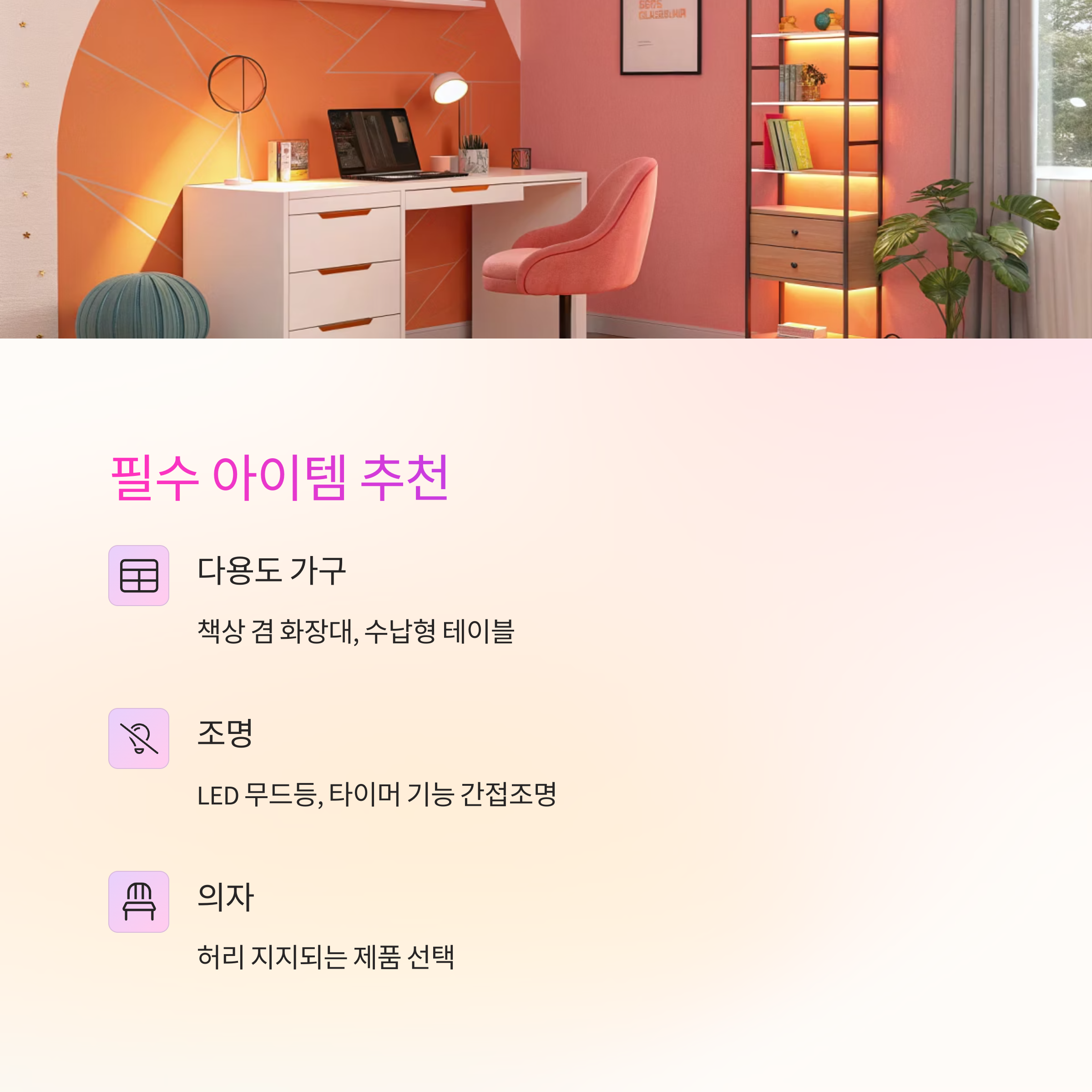 조명은 미니 무드등이나 타이머 기능이 있는 간접조명이 좋고, 전기요금 걱정 없는 LED 제품이면 더 좋아요. 방 안이 너무 심심하다면 가랜드 조명이나 북유럽 감성 조명 하나로 분위기 바꿀 수 있어요.
