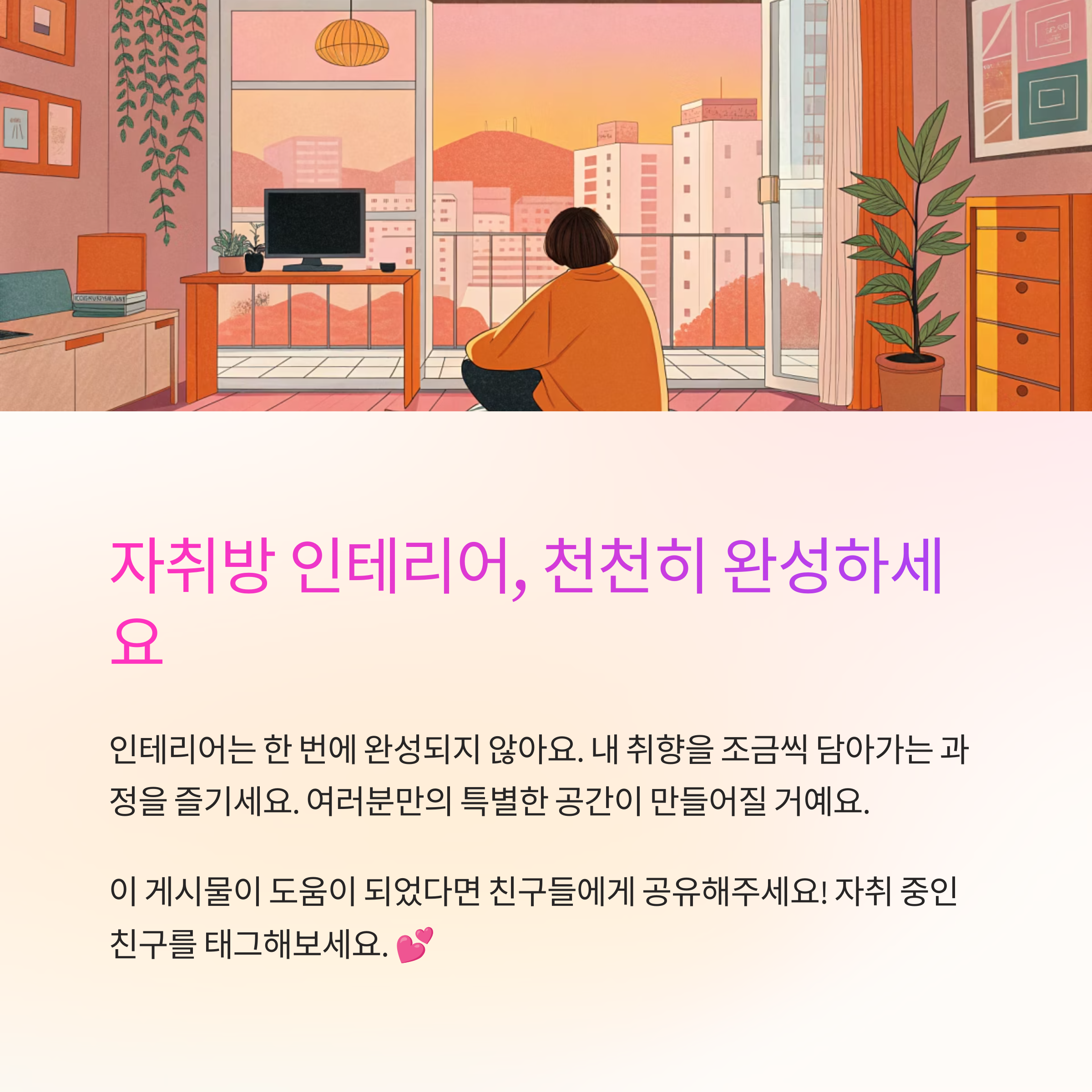 마지막 팁은 너무 욕심내지 않는 거예요. 인테리어는 한 번에 완성되지 않아요. 천천히 내 취향대로 채워가는 과정을 즐기면, 어느새 감성 가득한 대전 자취방이 완성돼 있을 거예요. 🏠