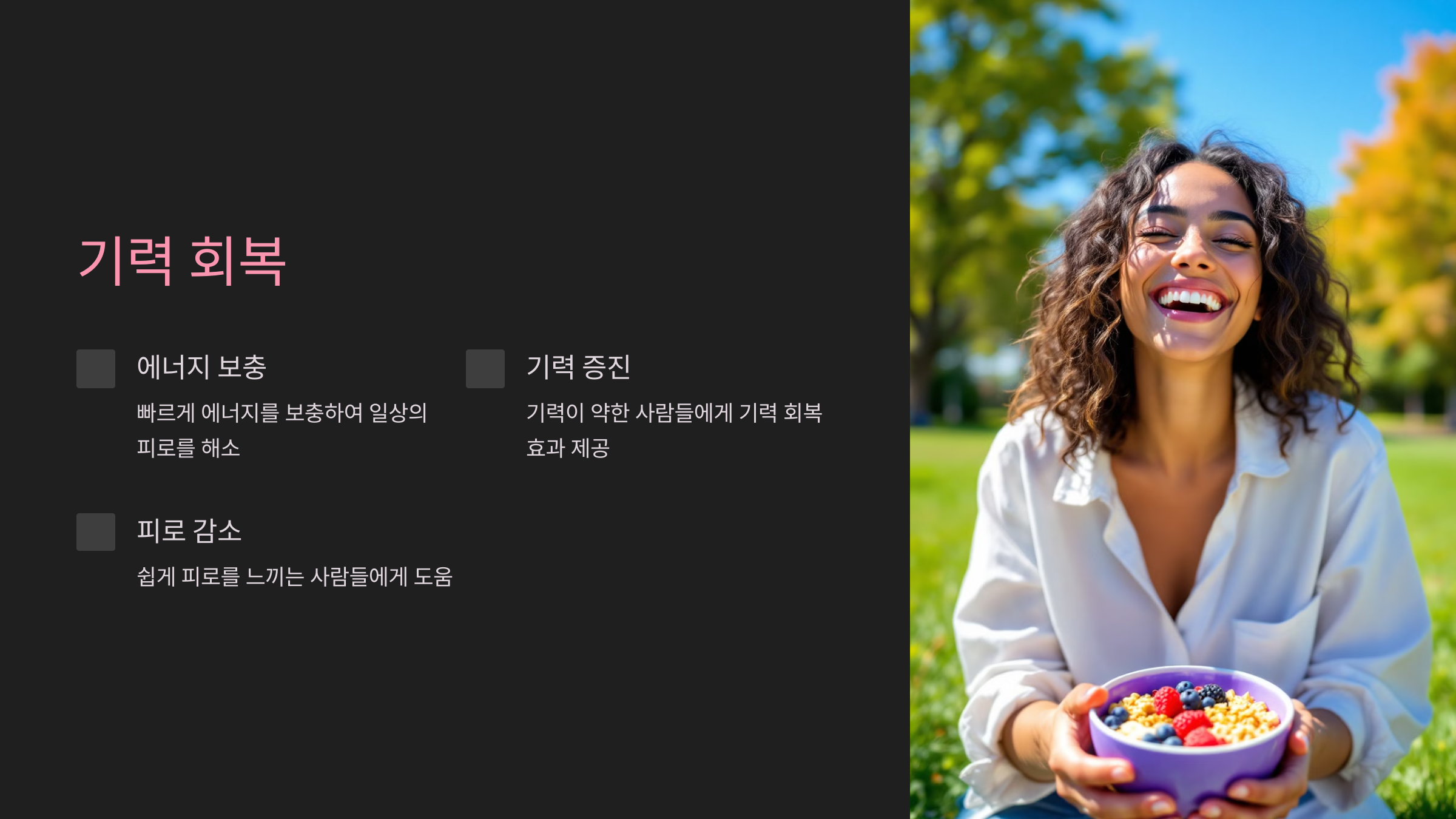 에너지를 빠르게 보충하여 일상에서 피로를 쉽게 느끼는 사람들에게 기력 회복 효과를 제공합니다.