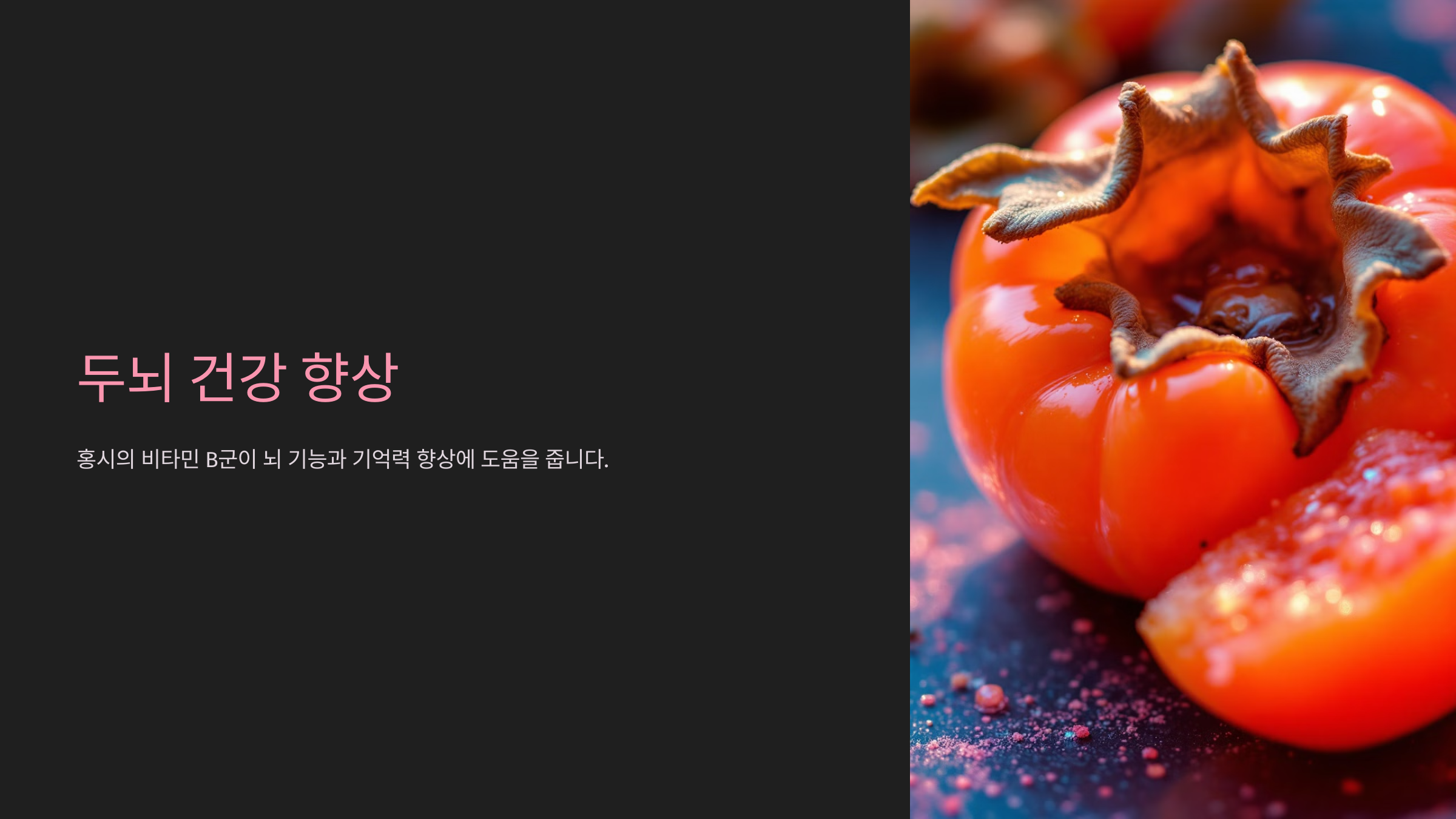 홍시에 포함된 비타민 B군은 뇌 기능 활성화와 기억력 향상에 기여하여, 두뇌 건강 유지에 효과적입니다.