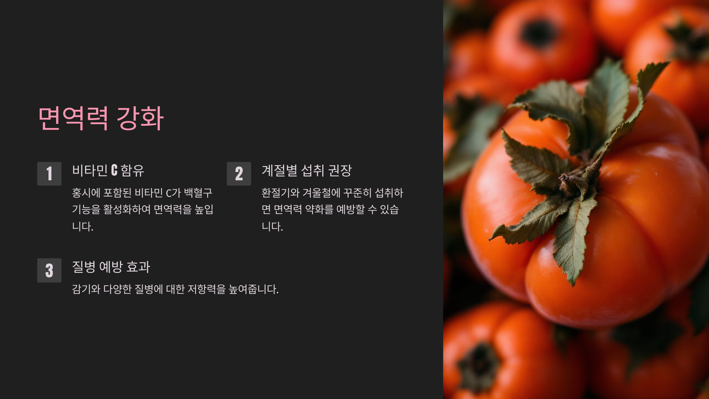 홍시에 포함된 비타민 C는 백혈구 기능을 활성화하여 감기와 다양한 질병에 대한 저항력을 높입니다.