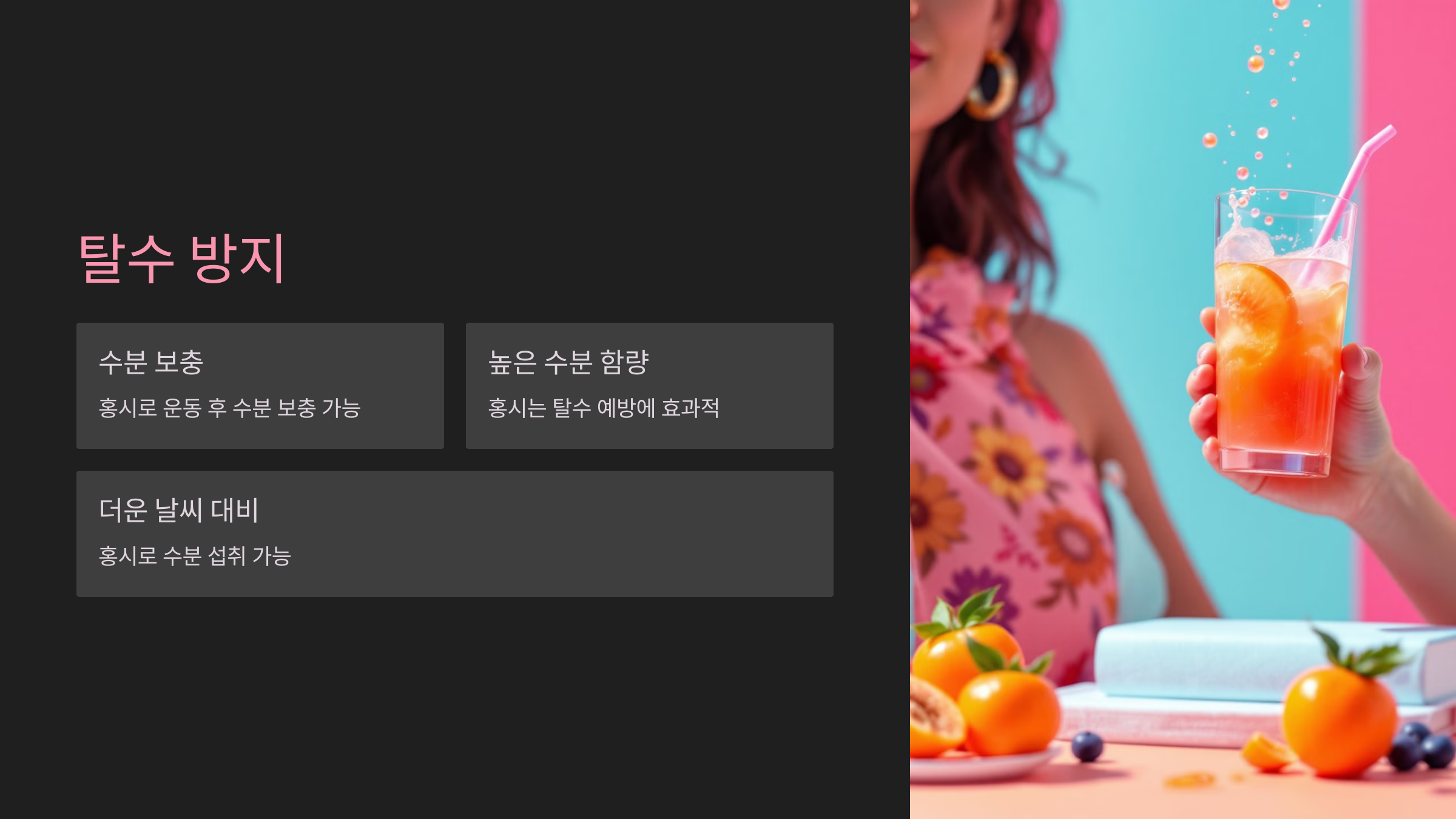 홍시는 수분 함량이 높아 탈수 예방에 좋으며, 운동 후나 더운 날 수분을 보충하는 데 효과적입니다.