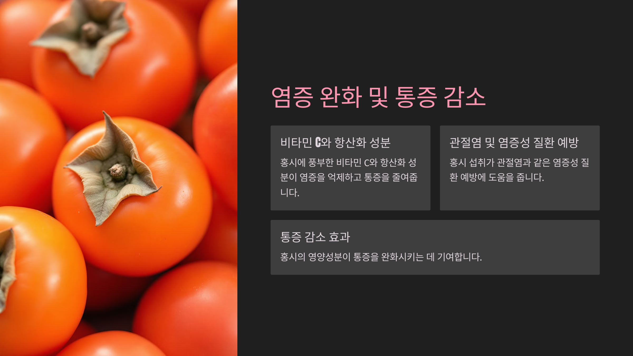 홍시의 항산화 성분이 체내 염증을 줄이고 통증을 완화합니다.
