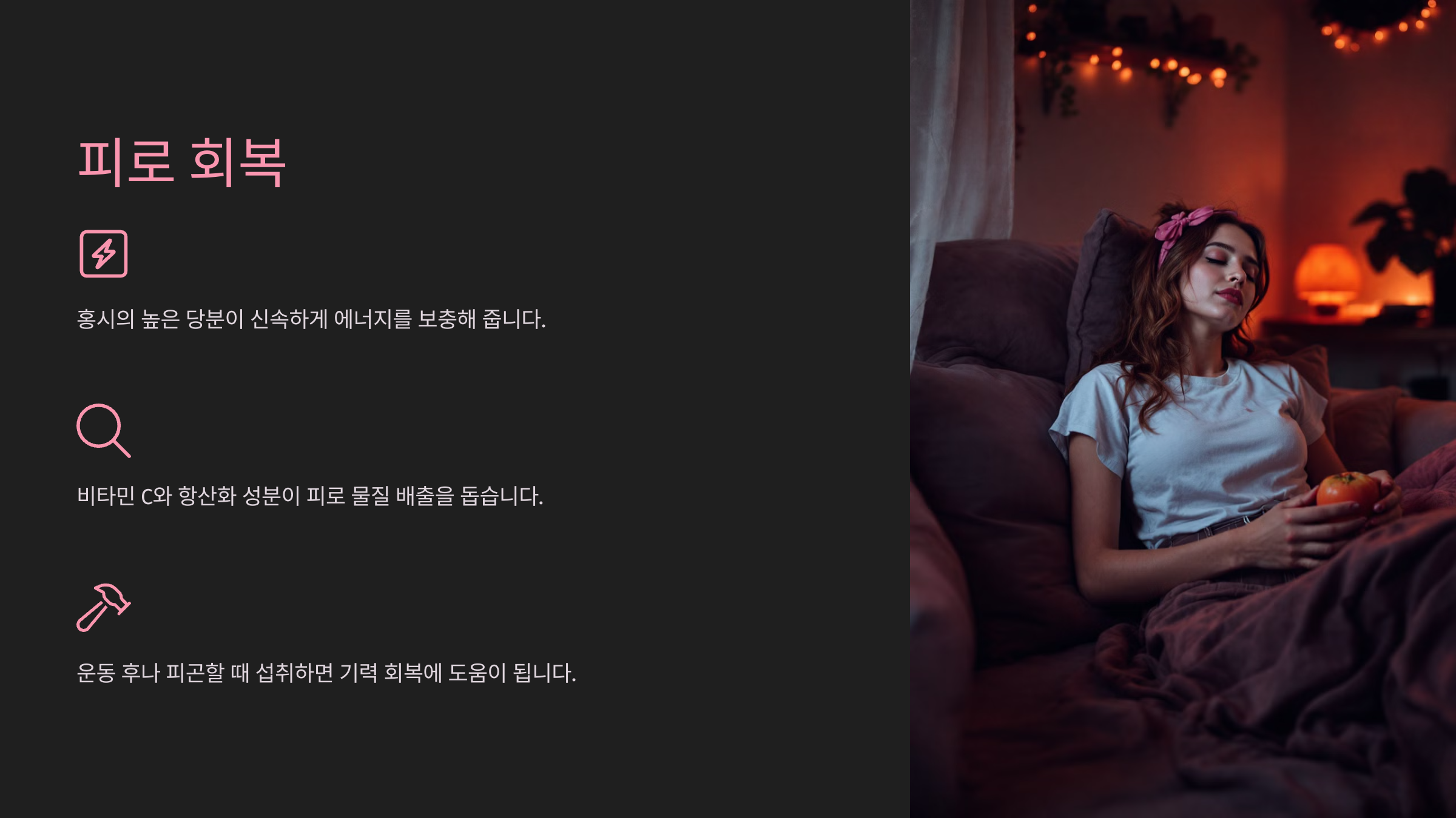 홍시는 높은 당분 덕분에 신속하게 에너지를 보충해 주며, 비타민 C와 항산화 성분은 피로 물질 배출을 돕습니다.