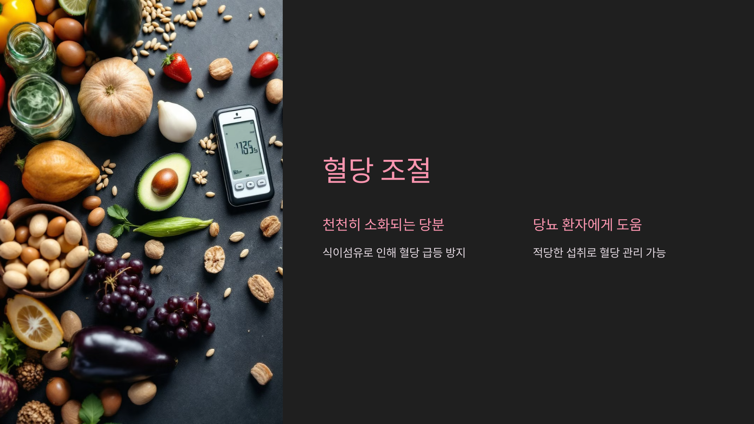 식이섬유 덕분에 혈당 급등을 방지하지만, 과다 섭취는 피하는 것이 좋습니다.