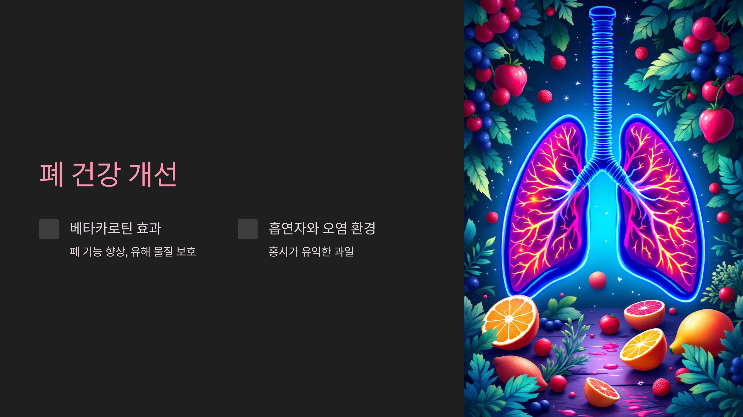 베타카로틴이 폐 기능을 향상시키고 유해 물질로부터 폐를 보호해줍니다.