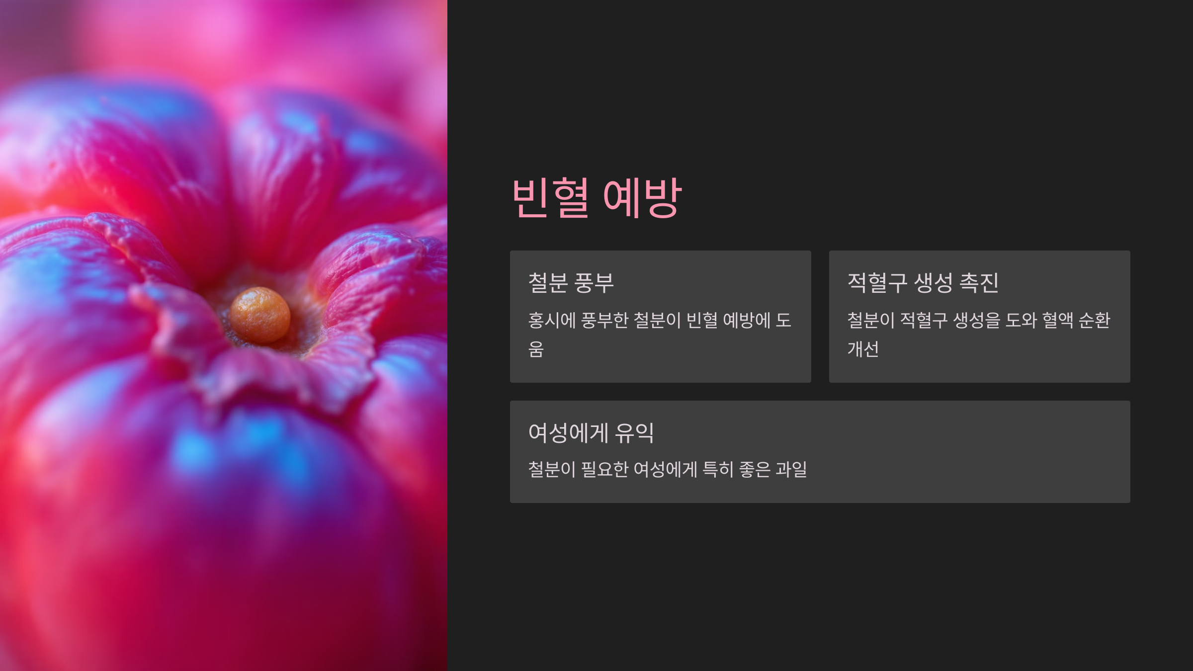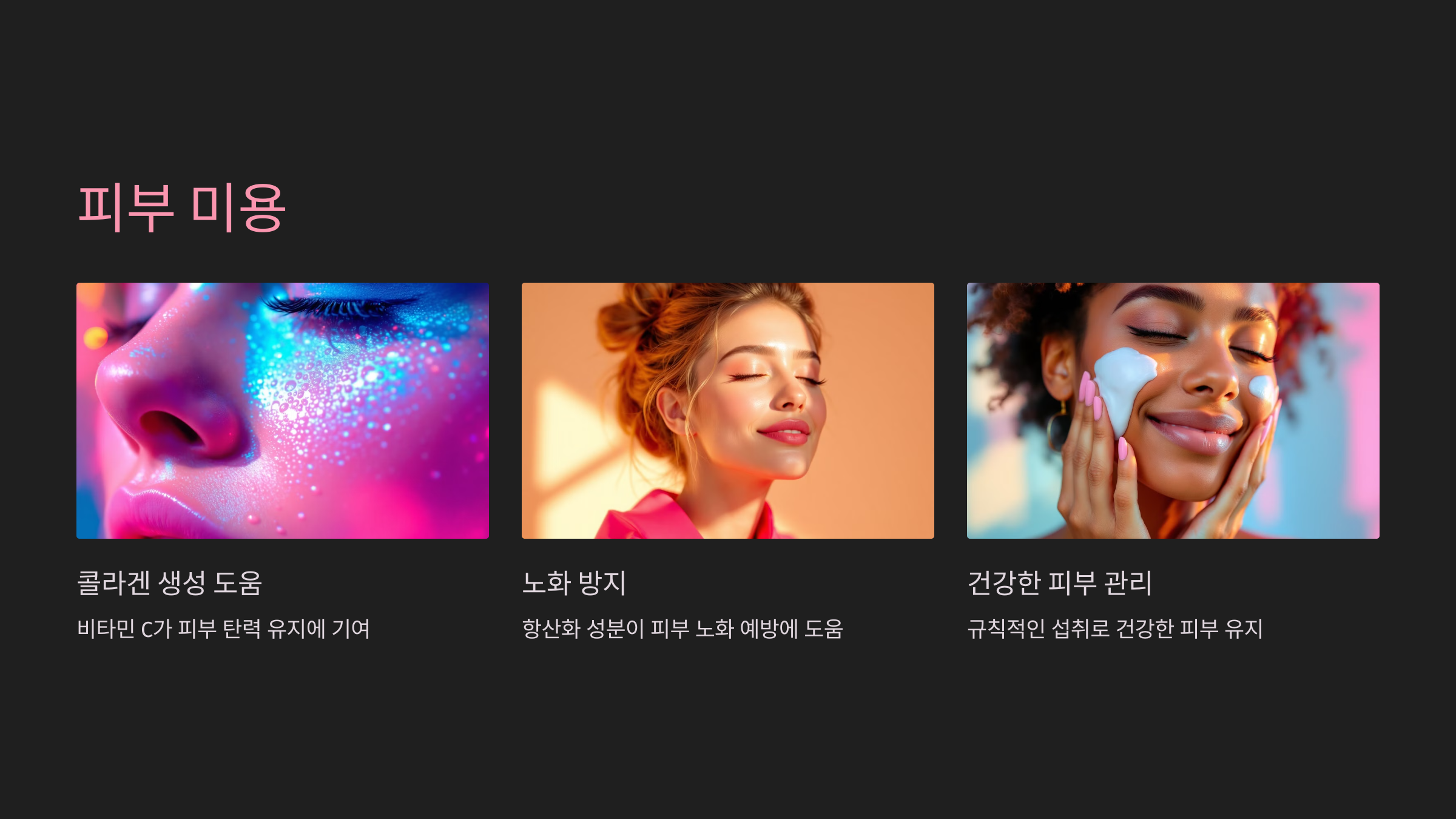 비타민 C가 콜라겐 생성을 도와 피부 탄력을 유지하고, 항산화 성분이 피부 노화 방지에 도움을 줍니다.