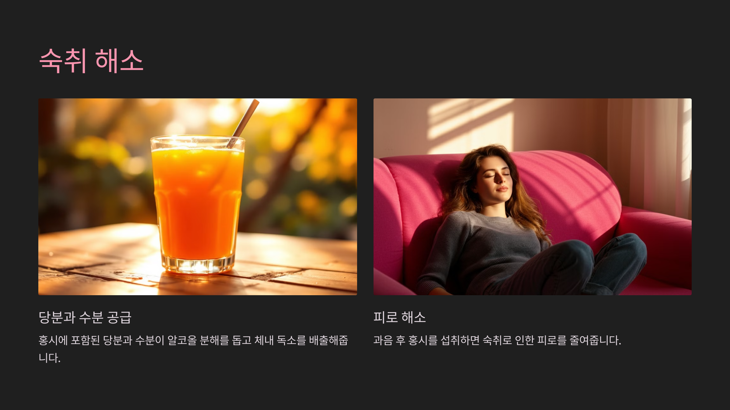 당분과 수분이 알코올 분해를 돕고 체내 독소를 배출해줍니다.