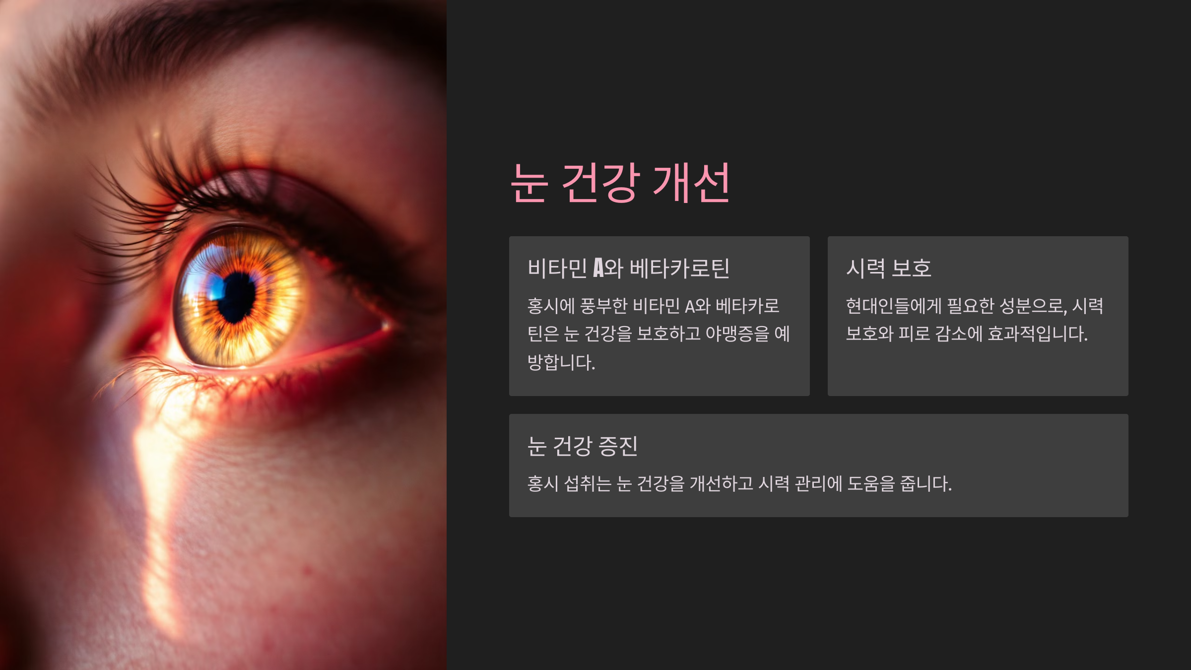 홍시의 비타민 A와 베타카로틴은 눈 건강을 보호하며 야맹증을 예방합니다.