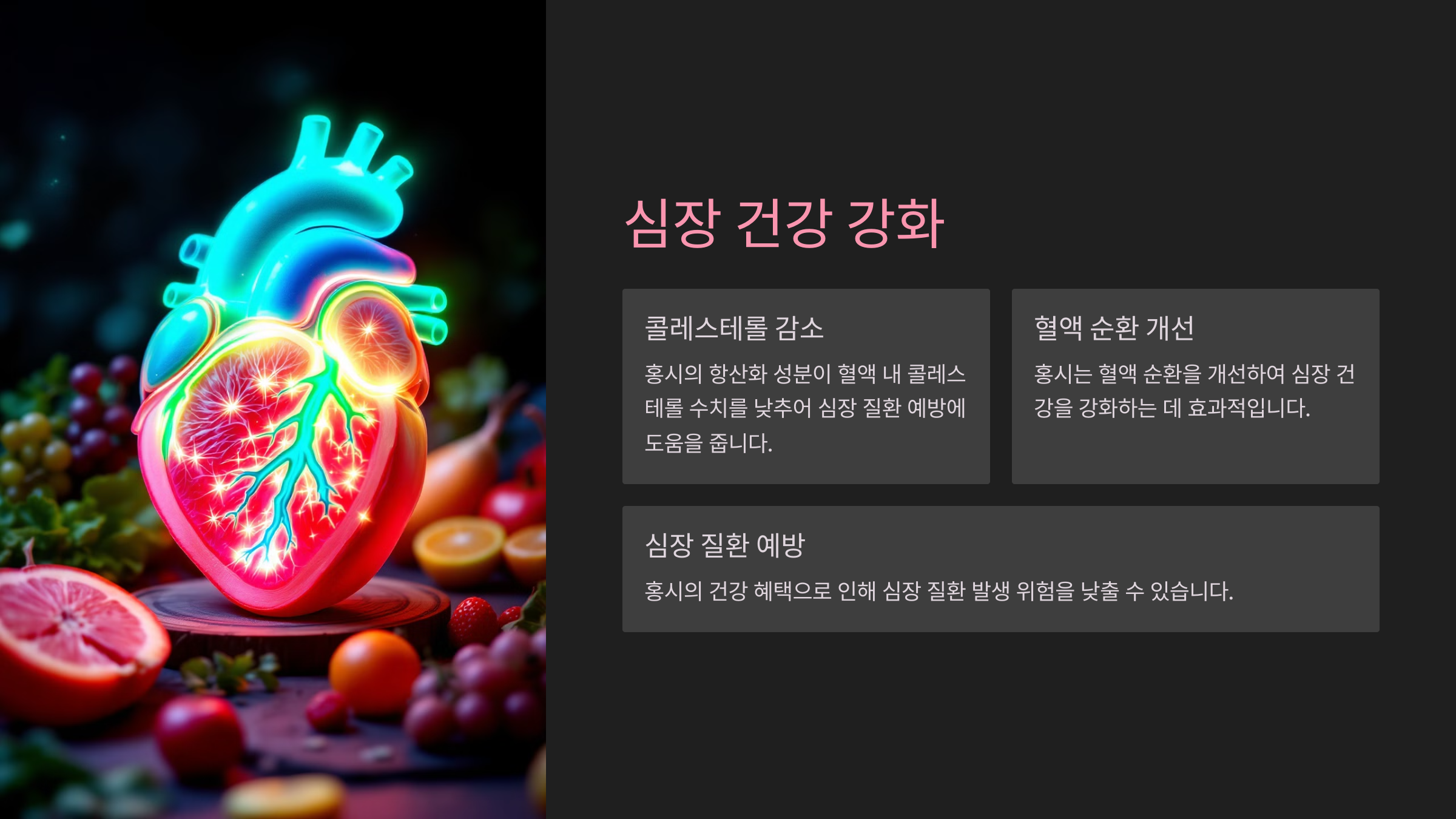 홍시에 포함된 항산화 성분은 혈액 내 콜레스테롤 수치를 낮추고 혈액 순환을 개선하여 심장 질환 예방에 효과적입니다.