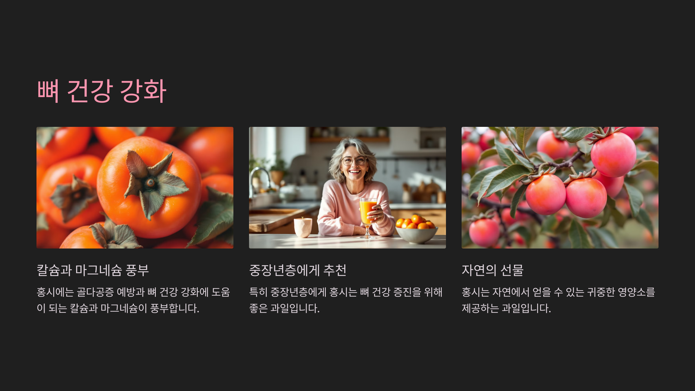 홍시의 칼슘과 마그네슘 성분은 골다공증 예방과 뼈 건강 강화에 유익합니다.