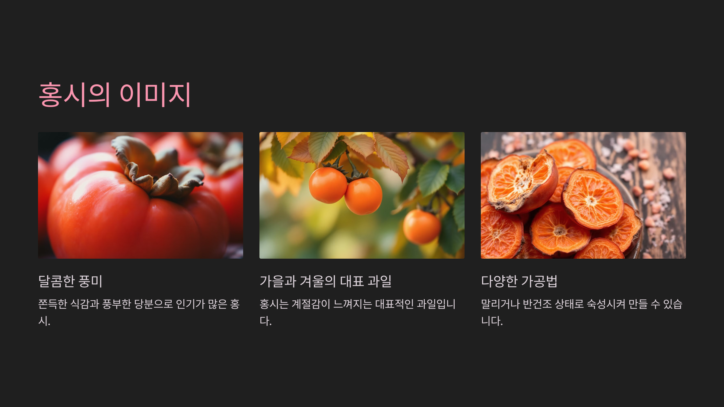홍시는 가을과 겨울철 대표적인 계절 과일로, 감을 말리거나 반건조 상태로 숙성시켜 만든 달콤한 과일입니다.