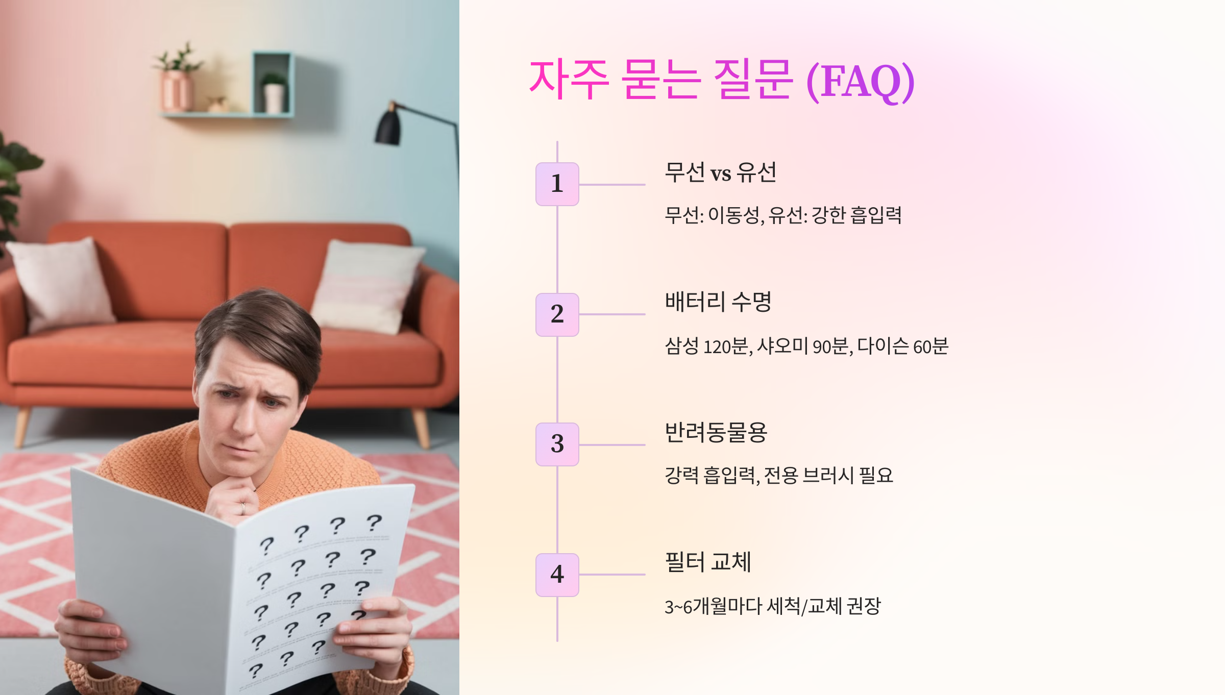 Q1. 무선 청소기와 유선 청소기 중 어떤 것이 더 좋나요?