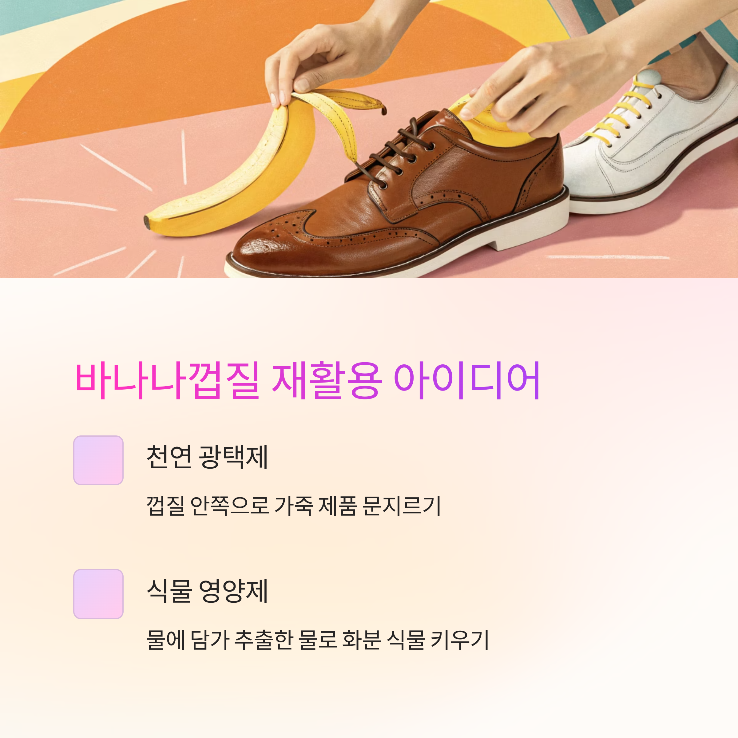 버리기만 아까운 바나나껍질은 의외로 다양한 활용 방법이 있어요. 대표적인 예로 천연 광택제로 활용할 수 있어요. 바나나껍질 안쪽으로 가죽 제품을 문질러주면 윤기가 살아나요.