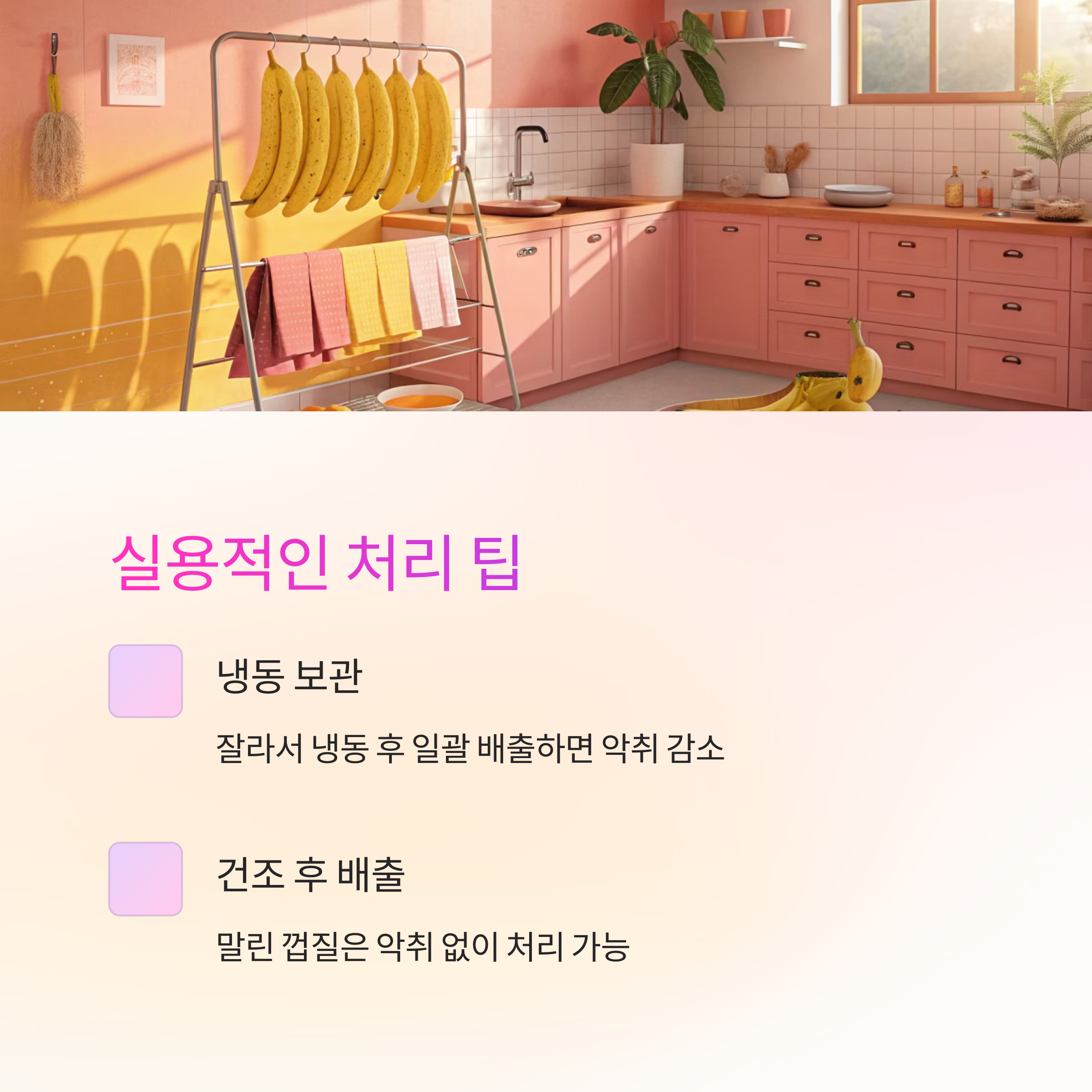 또 하나의 팁은 껍질을 말려서 일반쓰레기로 배출하는 거예요. 바싹 마른 바나나껍질은 악취 없이 쓰레기봉투에 넣기 훨씬 쉬워져요.