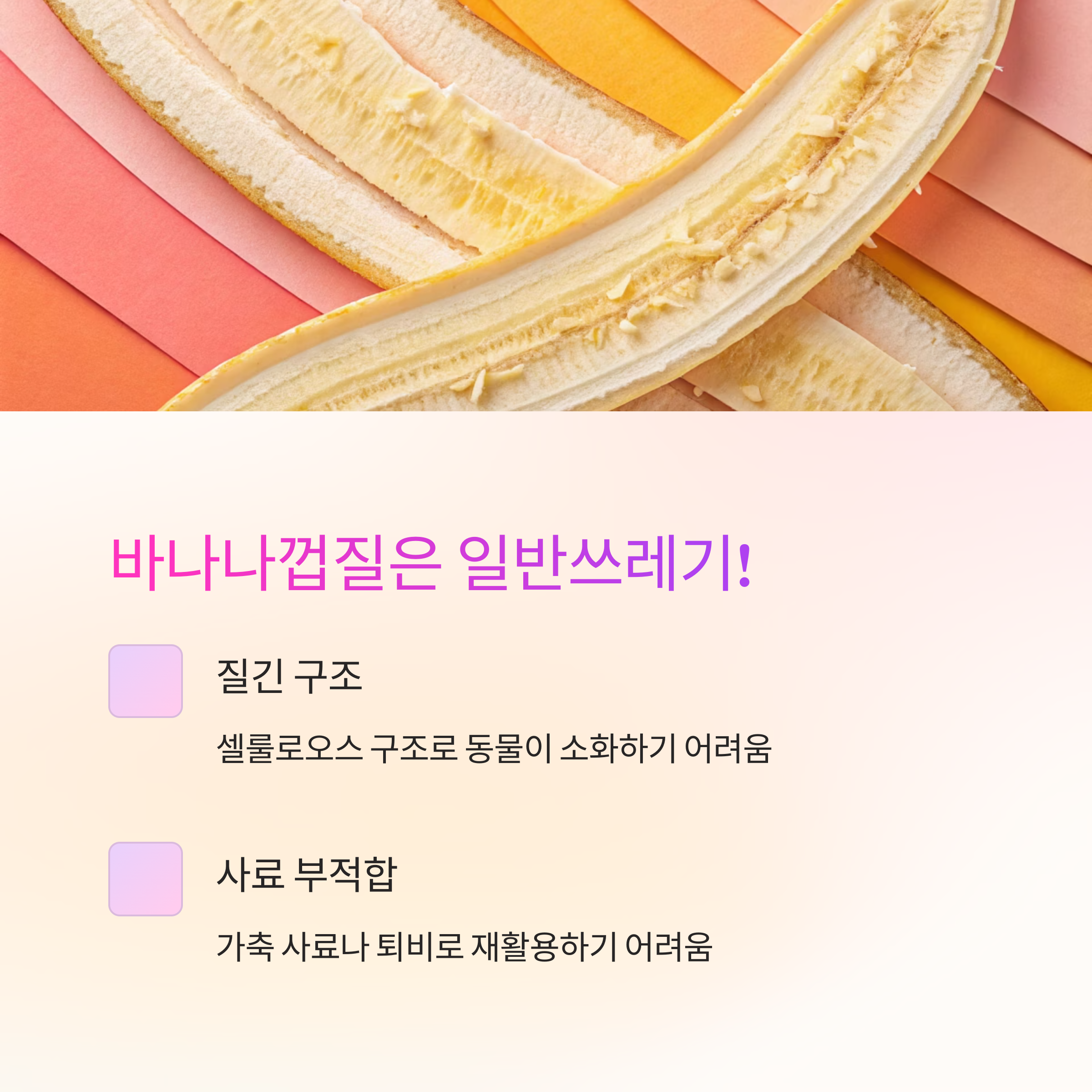 왜냐하면 바나나껍질은 동물이 소화하기 어려운 셀룰로오스 구조로 되어 있어 사료로 활용하기 어렵기 때문이에요. 또, 분쇄기 사용이나 퇴비화 처리 과정에서도 어려움을 주는 경우가 많아요.